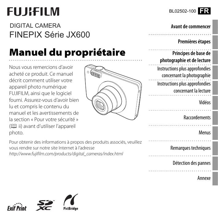 Nous vous remercions d'avoir acheté ce produit. Ce manuel décrit comment utiliser votre apparéil photo numérique FUJIFILM, ainsi que le logiciel fourni. Assurez-vous d'avoir bien lu et compris le contenu du manuel et les averissements de la section « Pour votre sécurité » (ii) avant d'utiliser l' apparéil photo.