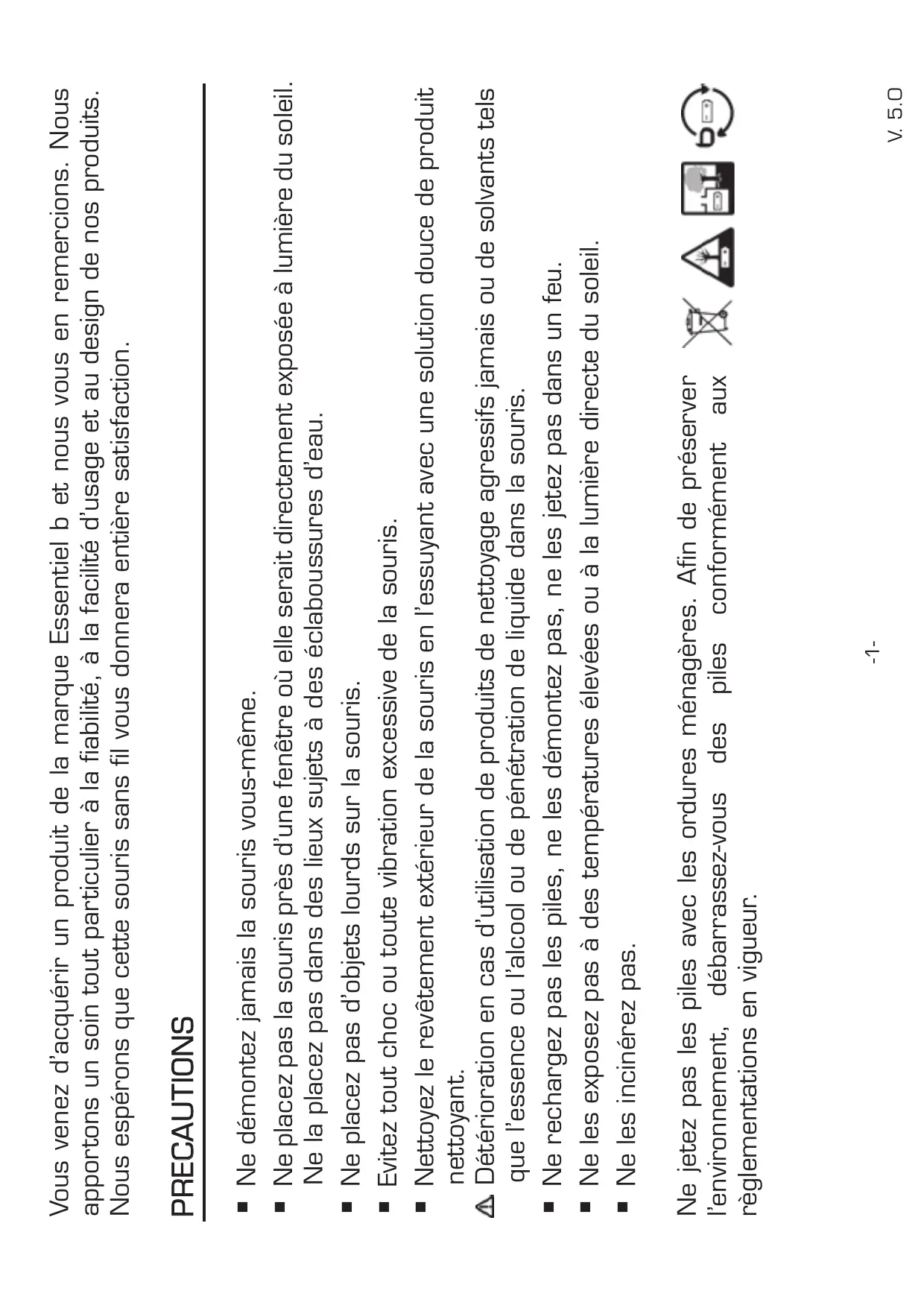 PRECAUTIONS Vous venez d’acquérir un produit de la marque Essentiel b et nous vous en remercions. Nous apportons un soin tout particulier à la fiabilité, à la facilité d’usage et au design de nos produits. Nous espérons que cette souris sans fil vous donnera entière satisfaction. -2V. 5.0 Attention : Syndrome LMR LMR signifie « Lésion due aux mouvements répétitifs ». Le syndrome LMR apparaît suite à de petits mouvements se répétant en permanence. Des symptômes typiques sont des douleurs dans les doigts ou la nuque. En prévention, nous vous conseillons de :