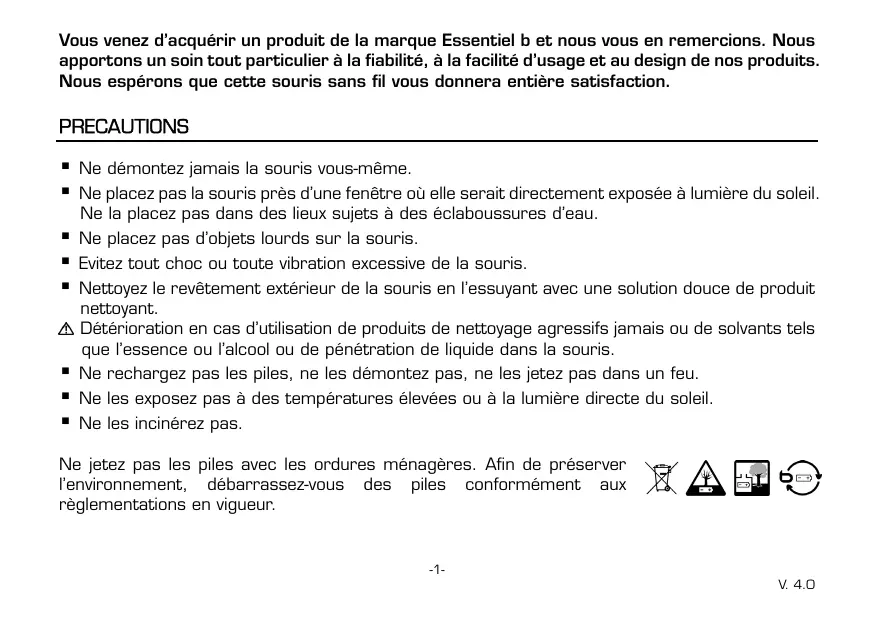 Vous venez d'acquérir un produit de la marque Essentiel b et nous vous en remercions. Nous apportons un soin tout particulier à la fiabilité, à la facilité d'utilisation et au design de nos produits. Nous espérons que cette souris sans fil vous donnera entière satisfaction.