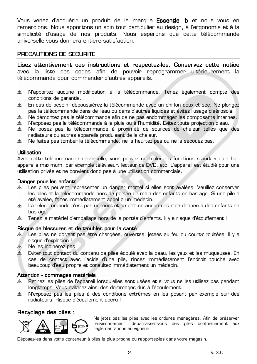 Vou venez d'acquerir un produit de la marque Essentiel b et nous vous en remercions. Nous apportons unsoon tout particulier au design, à l'ergonomie et à la simplicité d'usage de nos produits. Nous espérons que cette télécommande universelle vous donna rer entière satisfaction.