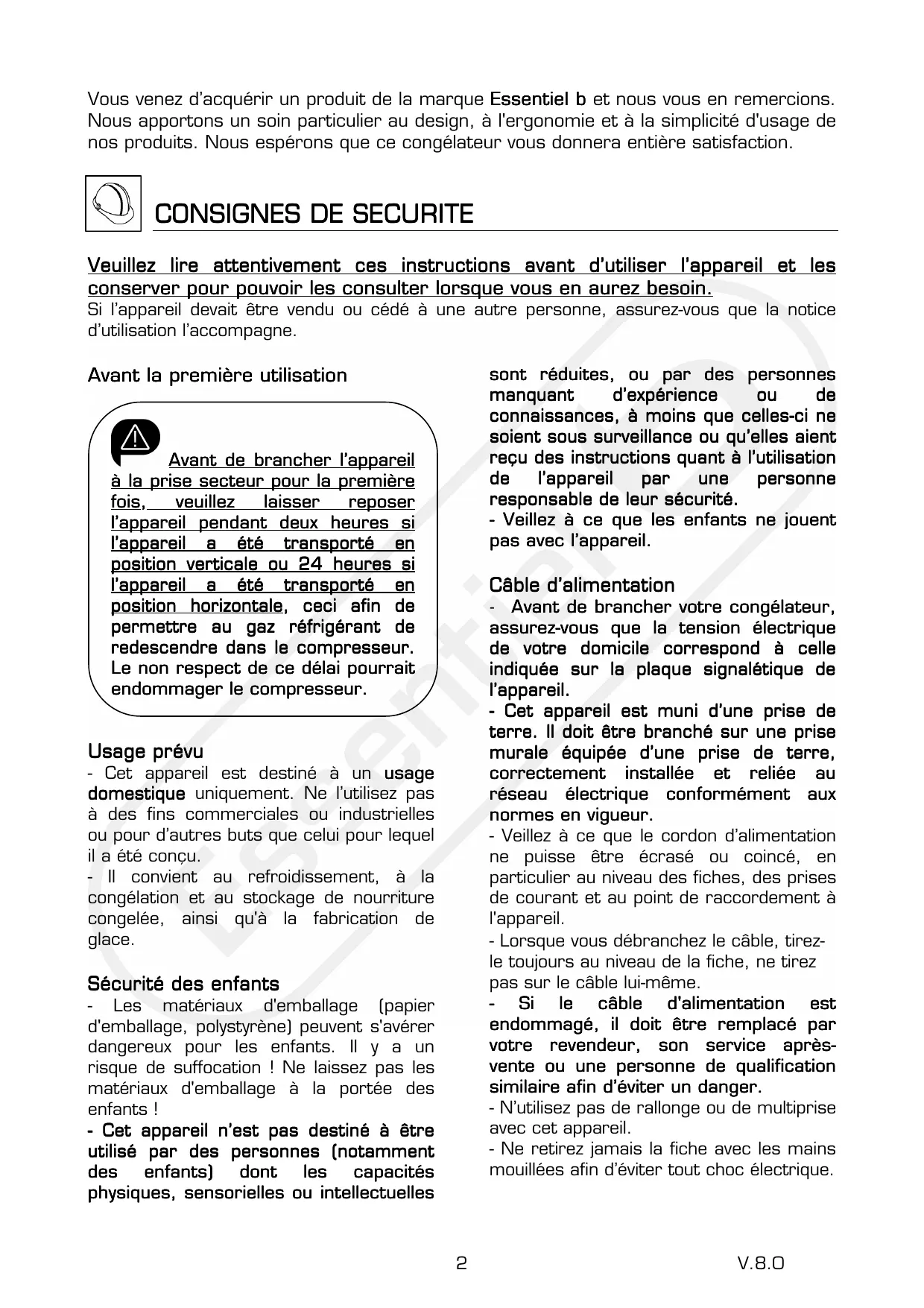 Vous venez d'acquérir un produit de la marque Essentiel b et nous vous en remercions. Nous apportons un soin particulier au design, à l'ergonomie et à la simplicité d'utilisation de nos produits. Nous espérons que ce congélateur vous donnera entière satisfaction.