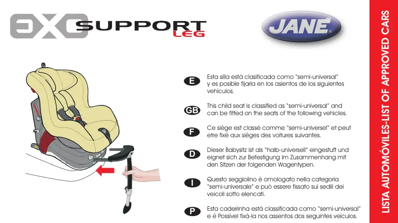 Téléchargez la notice de votre Siège auto enfant au format PDF gratuitement ! Retrouvez votre notice EXO SUPPORT LEG - JANE et reprennez votre appareil électronique en main. Sur cette page sont publiés tous les documents nécessaires à l'utilisation de votre appareil EXO SUPPORT LEG de la marque JANE.