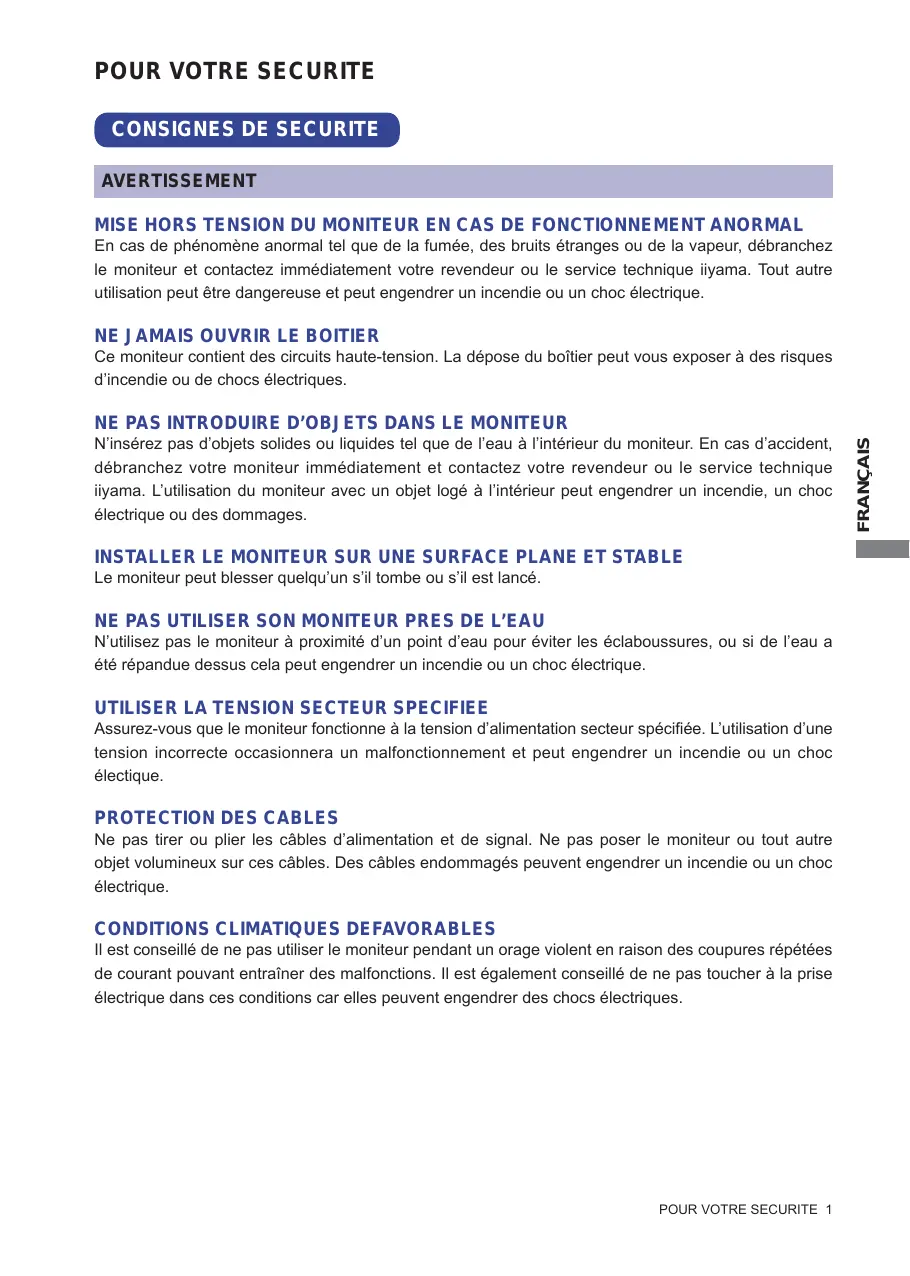 Ce moniteur contient des circuits haute-tension. La dépose du boîtier peut vous exposer à des risques d’incendie ou de chocs électriques. N’insérez pas d’objets solides ou liquides tel que de l’eau à l’intérieur du moniteur. En cas d’accident, débranchez votre moniteur immédiatement et contactez votre revendeur ou le service technique iiyama. L’utilisation du moniteur avec un objet logé à l’intérieur peut engendrer un incendie, un choc électrique ou des dommages. INSTALLER LE MONITEUR SUR UNE SURFACE PLANE ET STABLE Le moniteur peut blesser quelqu’un s’il tombe ou s’il est lancé. NE PAS UTILISER SON MONITEUR PRES DE L’EAU N’utilisez pas le moniteur à proximité d’un point d’eau pour éviter les éclaboussures, ou si de l’eau a été répandue dessus cela peut engendrer un incendie ou un choc électrique.