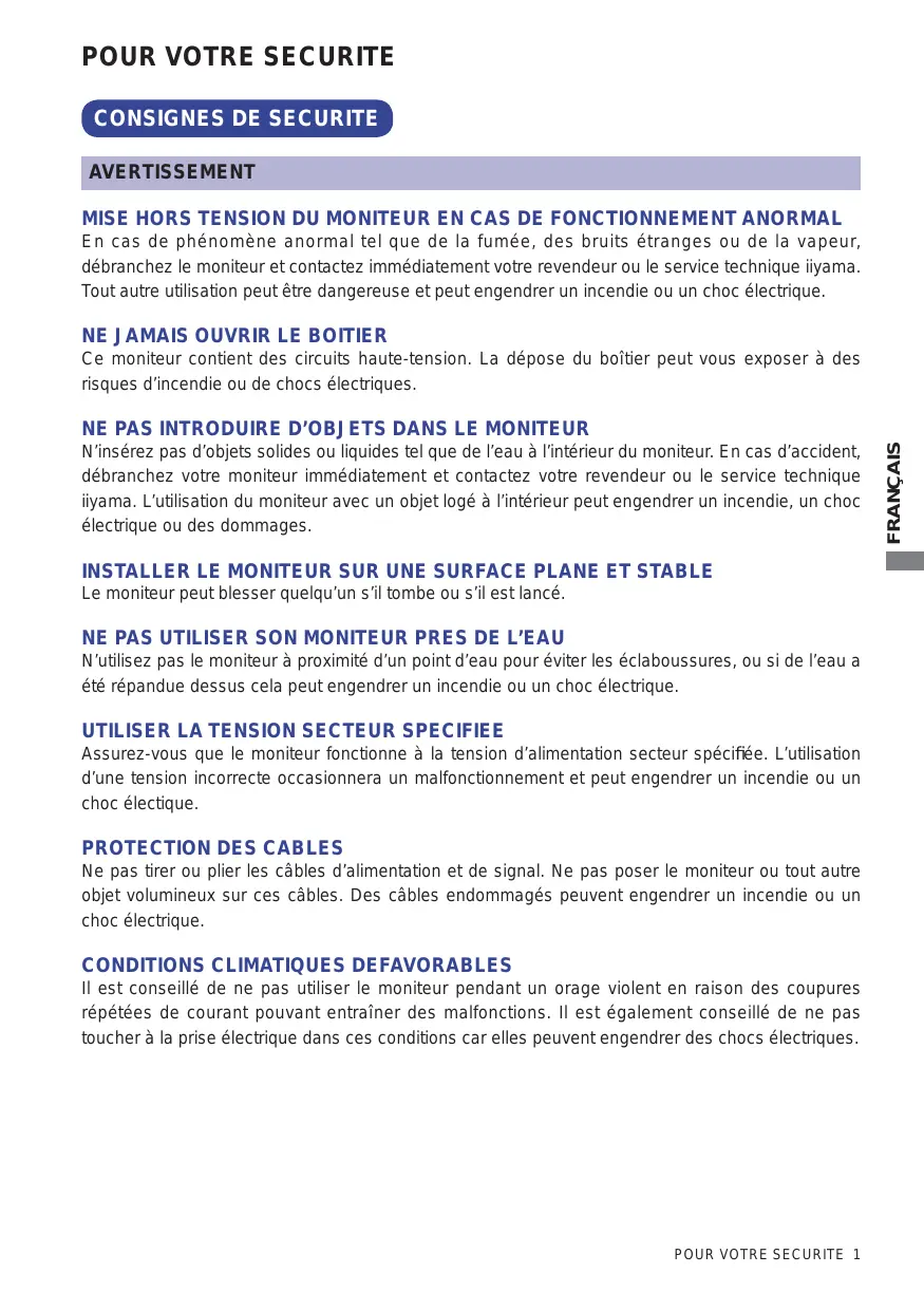 FRANÇAIS Merci d’avoir choisi le moniteur LCD iiyama. Nous recommandons pour lire ce manuel complet soigneusement avant d'installer et alimenter le moniteur. Conserver ce manuel pour toute référence ultérieure.