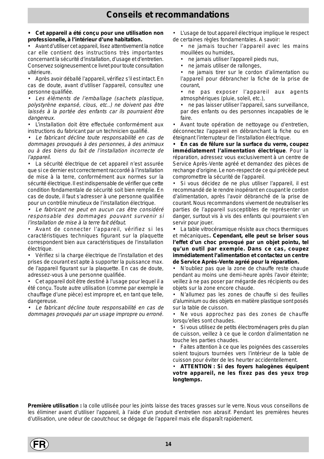 Première utilisation : la colle utilisée pour les joints laisse des traces grasses sur le verre. Nous vous conseillons de les éliminer avant d'utiliser l'appareil, à l'aide d'un produit d'entretien non abrasif. Pendant les premières heures d'utilisation, une oedur de caoutchouc se dégage de l'appareil mais elle disparait rapidement.