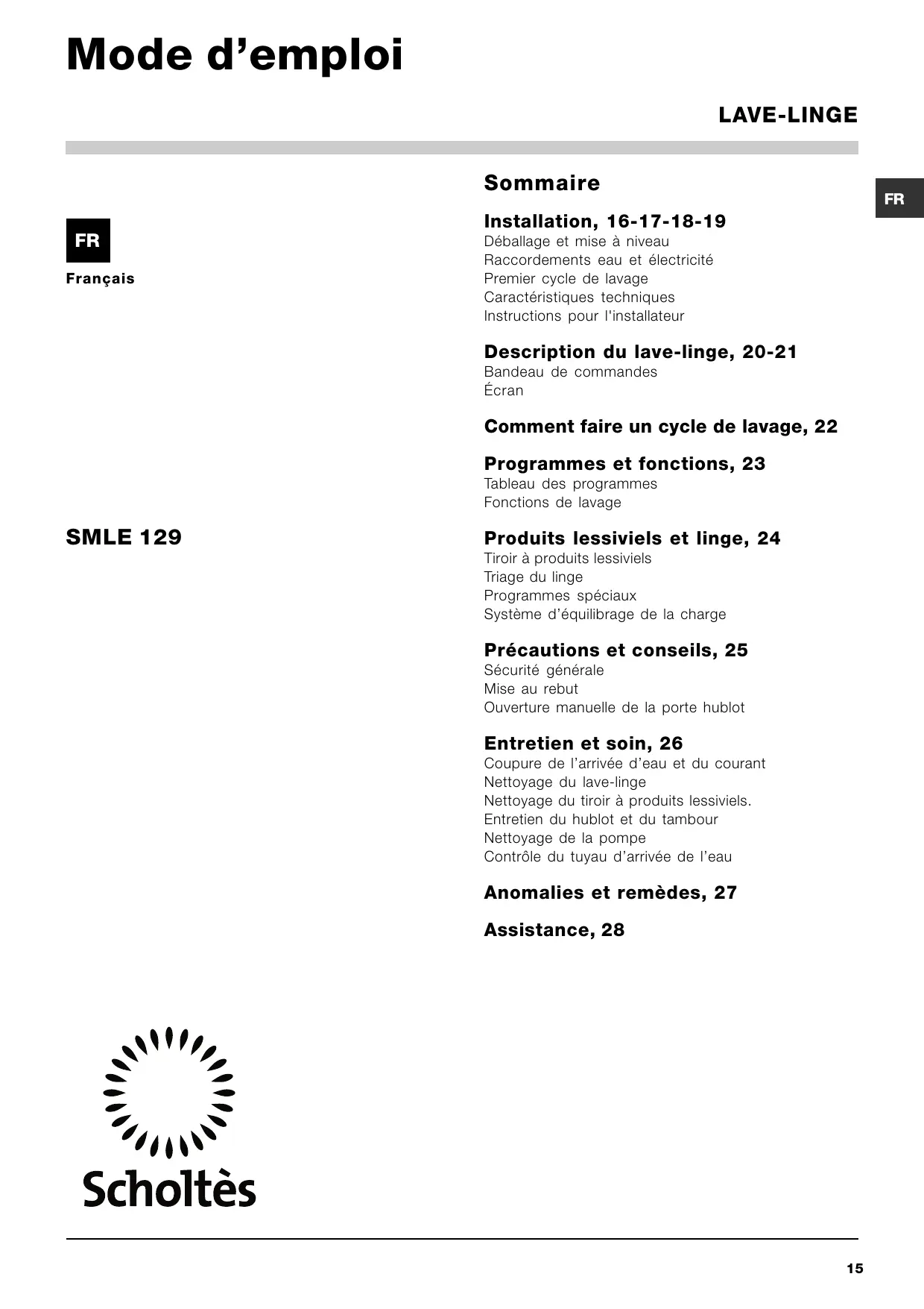 MAXI SMLE 129 - Machine à laver SCHOLTES - Notice d'utilisation et mode d'emploi gratuit