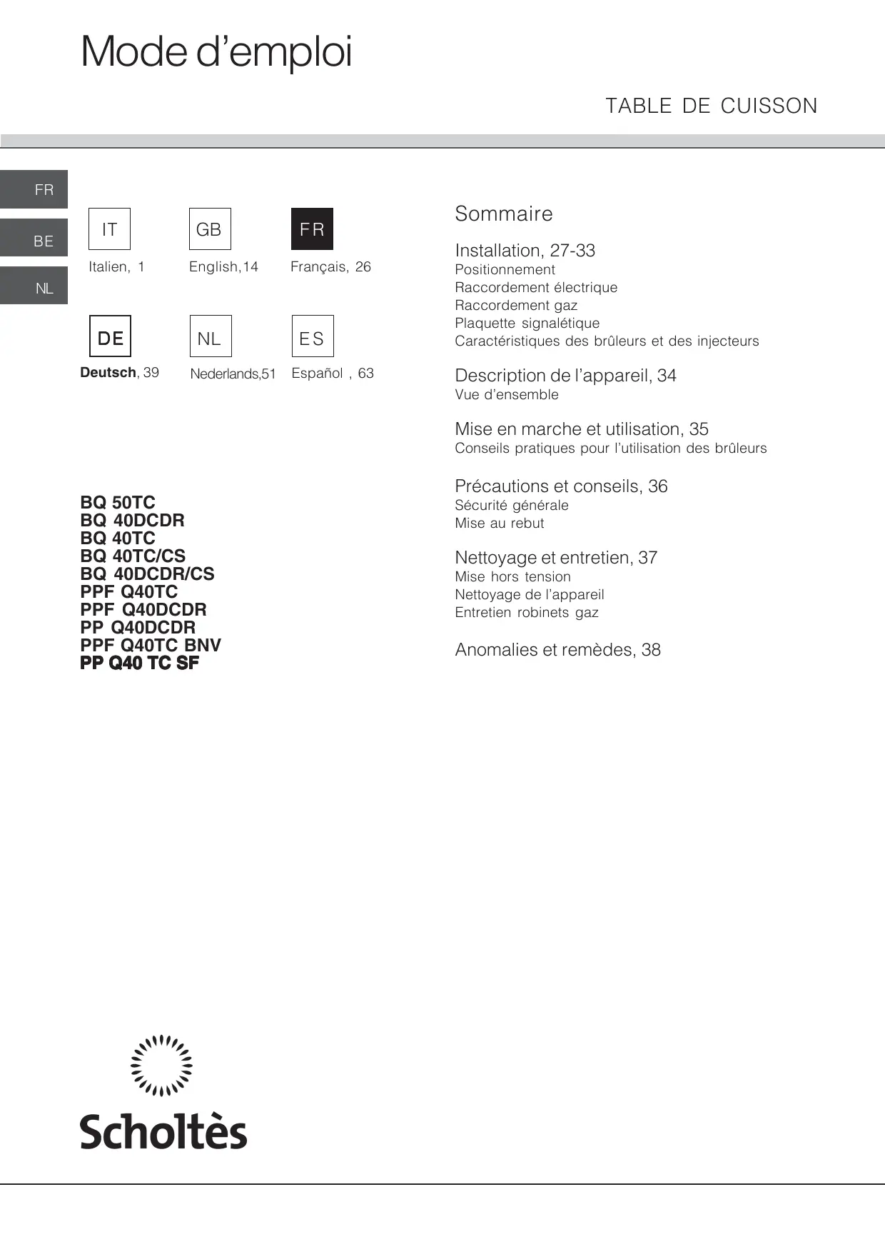 PPF Q40 TC - Cuisinière SCHOLTES - Notice d'utilisation et mode d'emploi gratuit