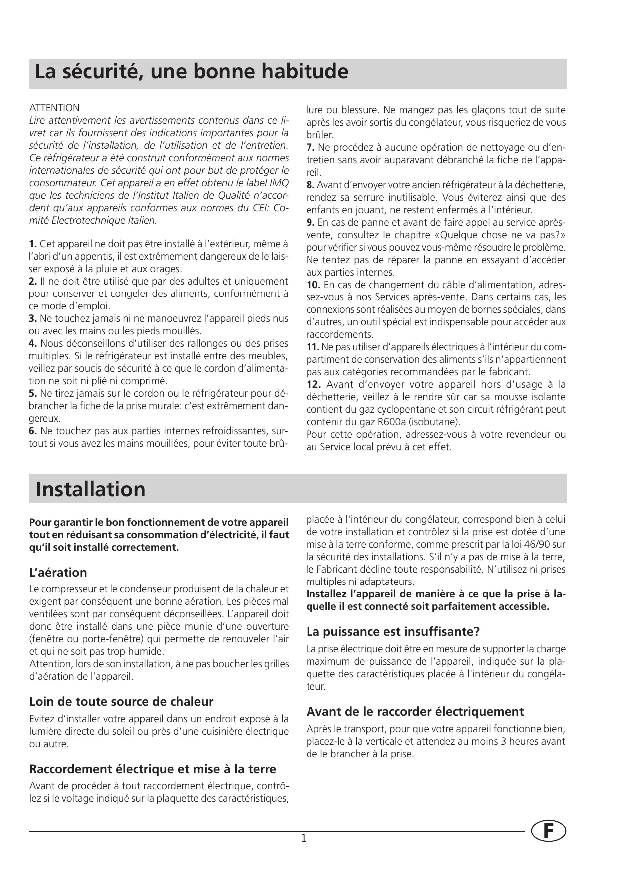 Lire attentivement les avertissements contenus dans ce li-vret car ils fournissant des indications importantes pour la sécurité de l'installation, de l'utilisation et de l'entretien. Ce réfrigérateur a été construit conformément aux normes internationales de sécurité qui ont pour but de protégger le consommateur. Cet apparéil a en effet obtenu le label IMQ que les techniciens de l'Institut Italien de Qualité n'accordent qu'aux apparéils conformes aux normes du CEI: Comité Electrotechnique Italien.