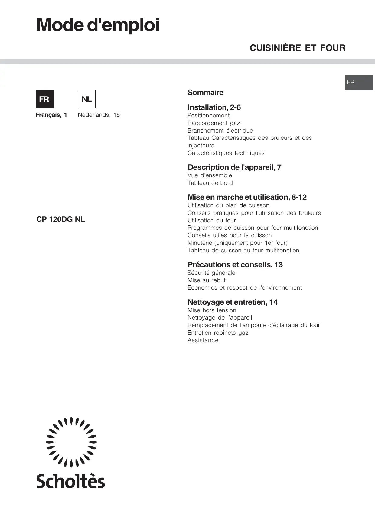 CP 120DG NL - Cuisinière et four SCHOLTES - Notice d'utilisation et mode d'emploi gratuit