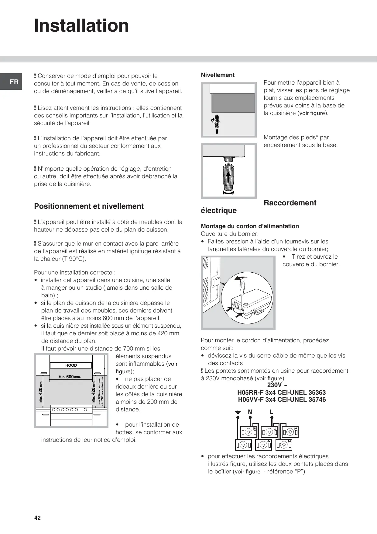 - pour l’installation de hottes, se conformer aux instructions de leur notice d’emploi. Raccordement électrique