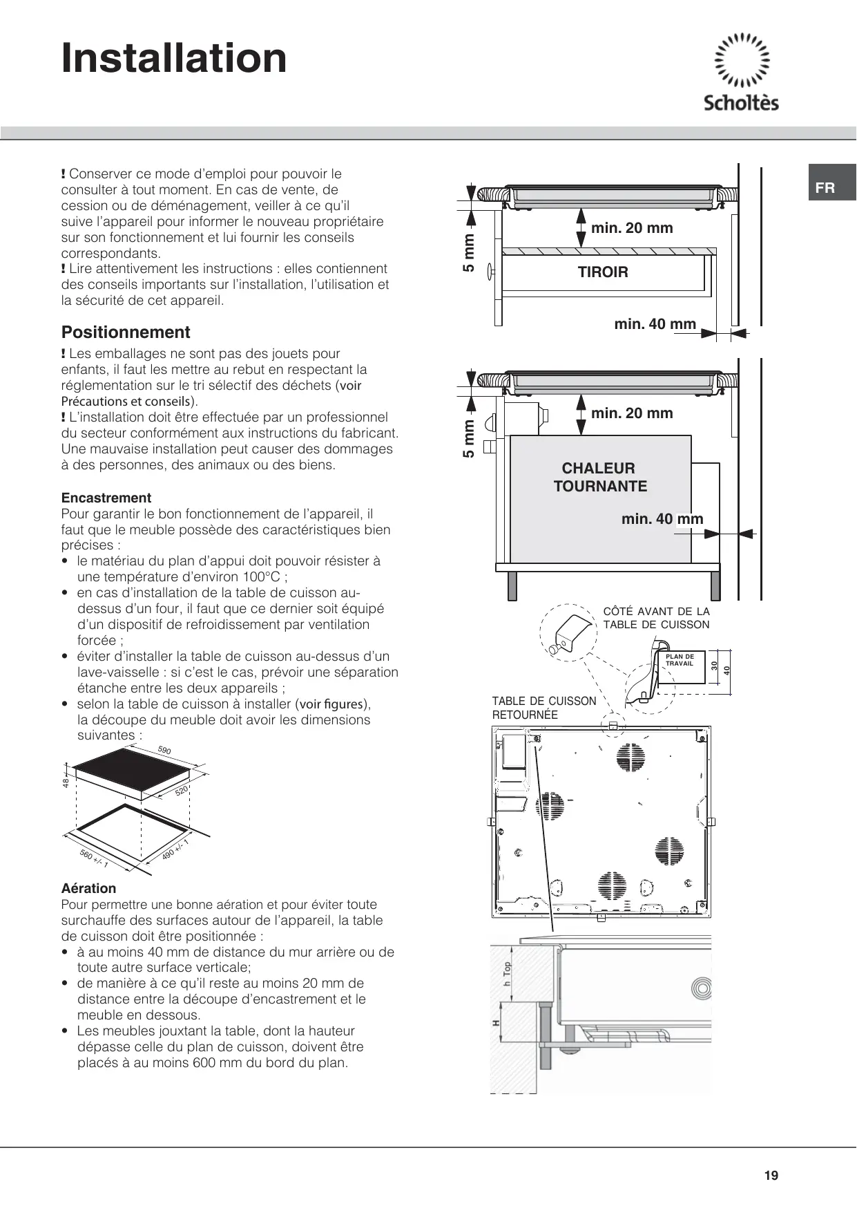 • à au moins 40 mm de distance du mur arrière ou de toute autre surface verticale; • de manière à ce qu’il reste au moins 20 mm de distance entre la découpe d’encastrement et le meuble en dessous. • Les meubles jouxtant la table, dont la hauteur dépasse celle du plan de cuisson, doivent être placés à au moins 600 mm du bord du plan.