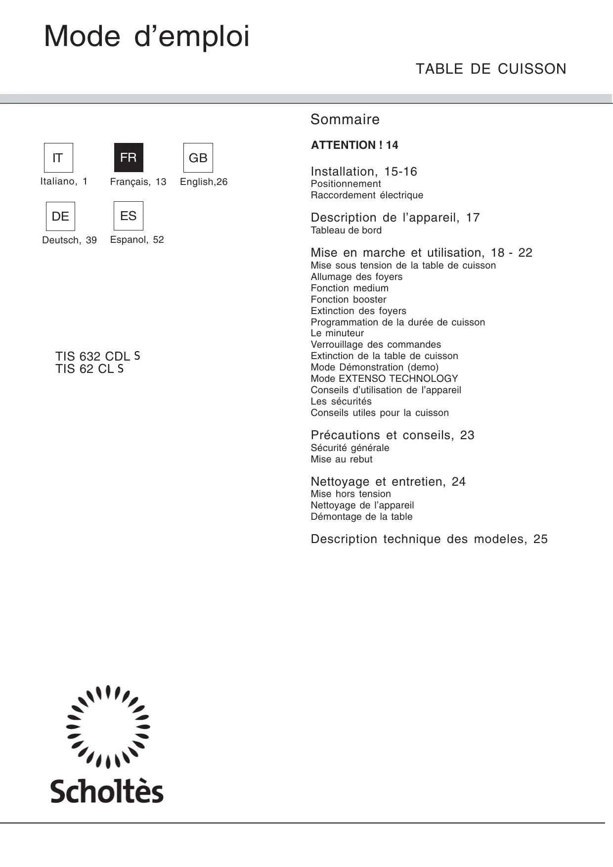TIS 632 CD L S - Plaque de cuisson SCHOLTES - Notice d'utilisation et mode d'emploi gratuit