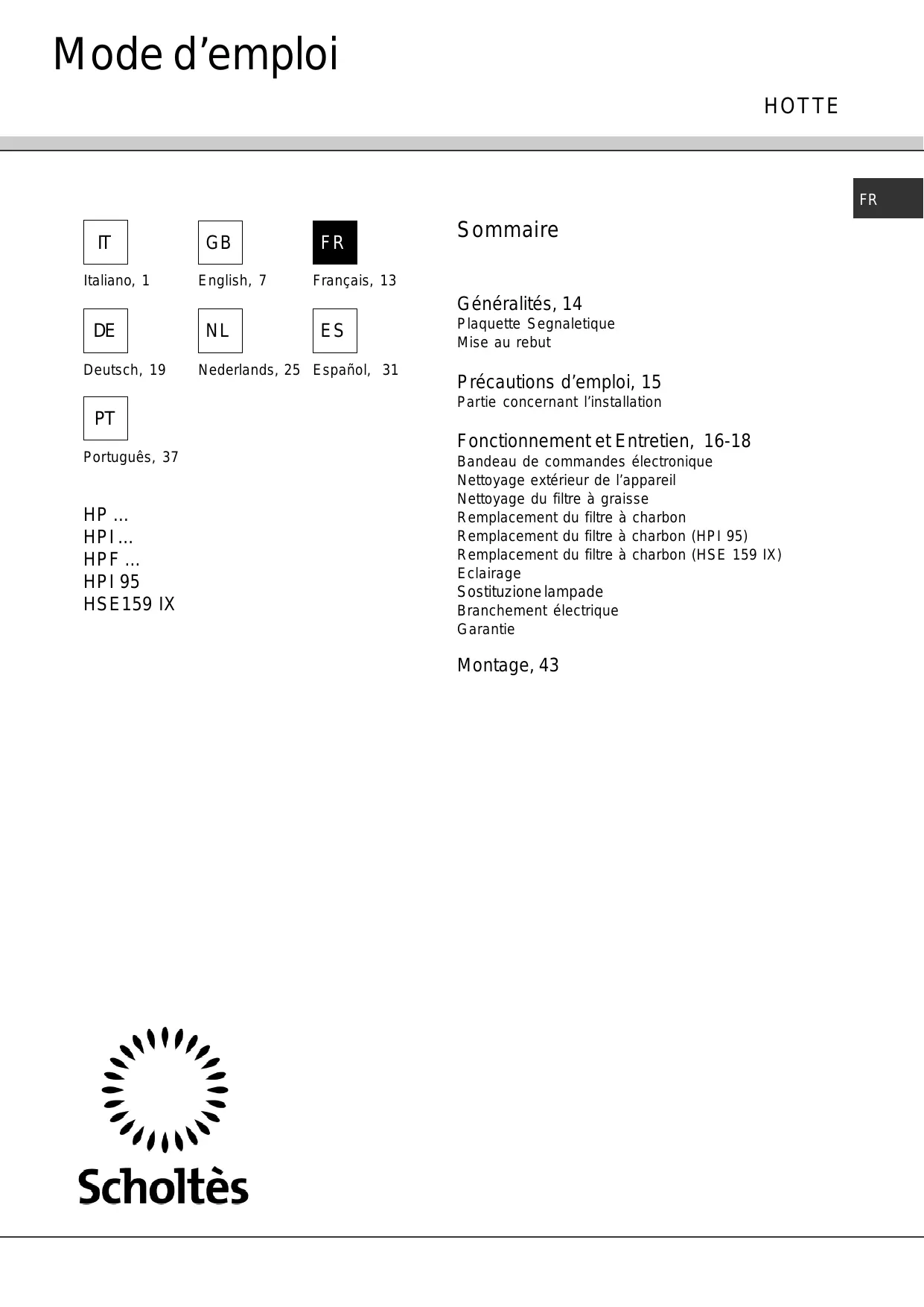 MODE D'EMPLOI HSE 159 IX SCHOLTES