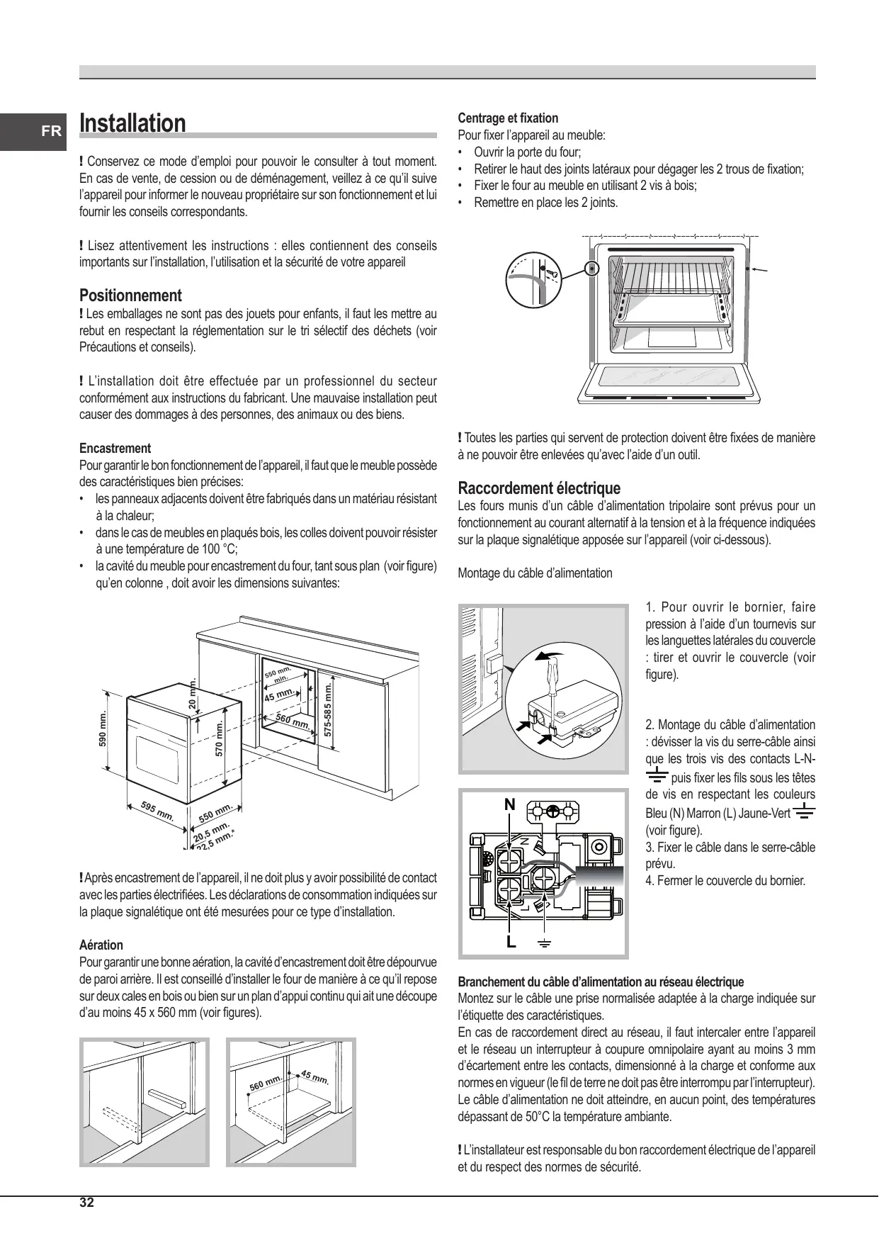 Pour garantir une bonne aération, la cavité d'encastrement doit être dépourvue de paroi arrêté. Il est conseilé dinstaller le four de manière à ce qu'il repose sur deux cales en bois ou bien sur un plan d'appui continu qui ait une découvert d'au moins 45 x 560 mm (voir figures).