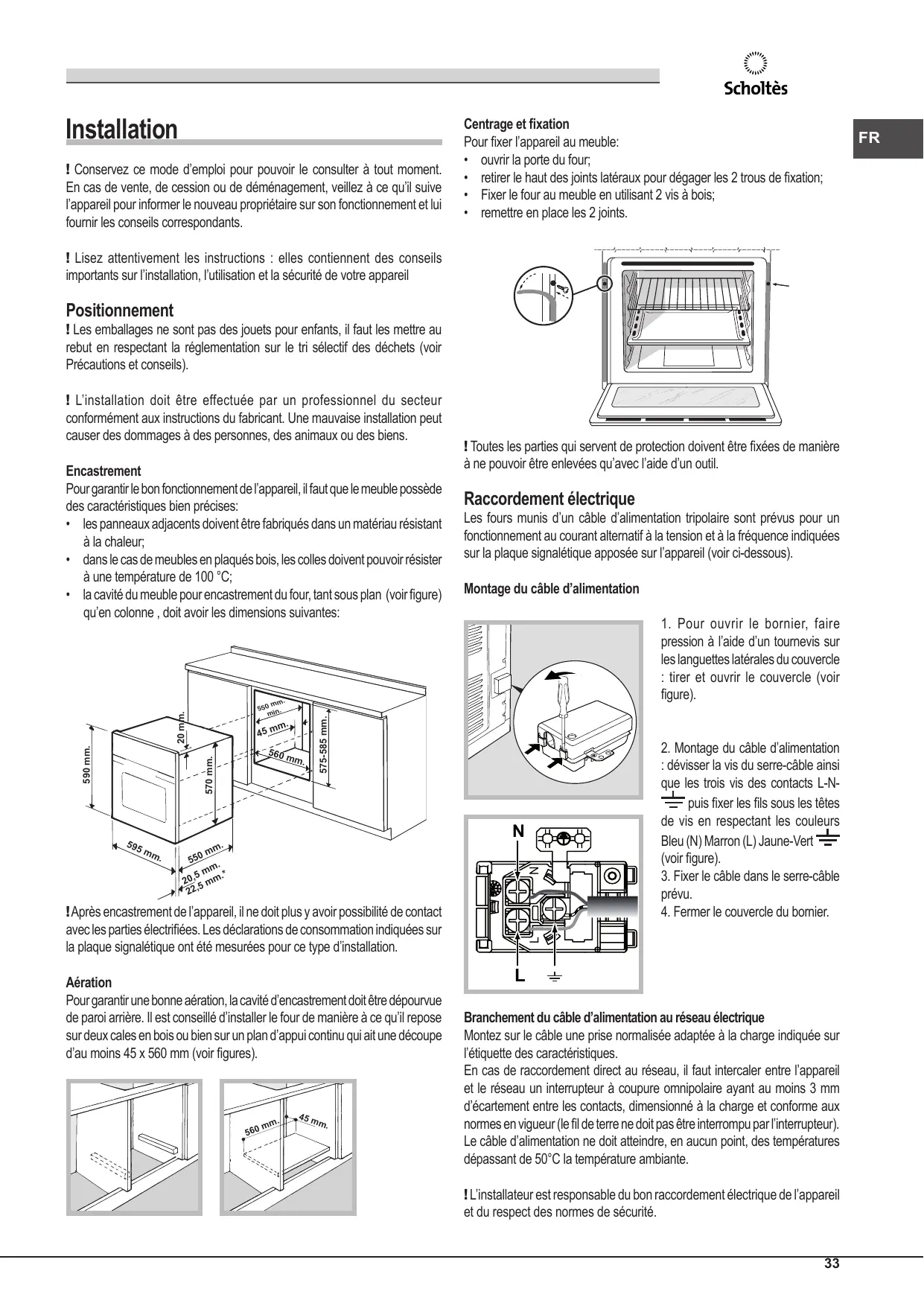 Les fours munis d’un câble d’alimentation tripolaire sont prévus pour un fonctionnement au courant alternatif à la tension et à la fréquence indiquées sur la plaque signalétique apposée sur l’appareil (voir ci-dessous). Montage du câble d’alimentation