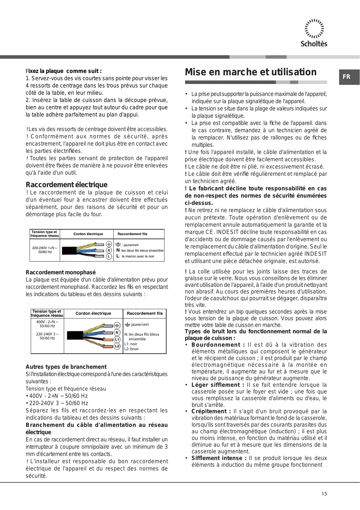 bien au centre et appuyez tout autour du cadre pour que la table adhère parfaitement au plan d'appui. ! Les vis des ressorts de centrage doivent être accessibles. ! Conformément aux normes de sécurité, après encastrement, l'appareil ne doit plus être en contact avec les parties électrifiées. ! Toutes les parties servant de protection de l'appareil doivent être fixées de manière à ne pouvoir être enlevées qu'à l'aide d'un outil. Raccordement électrique ! Le raccordement de la plaque de cuisson et celui d'un éventuel four à encastrer doivent être effectués séparément, pour des raisons de sécurité et pour un démontage plus facile du four. Tension type et fréquence réseau Cordon électrique Raccordement fils : jaune/vert 220-240V 1+N ~ 50/60 Hz N: les deux fils bleus ensemble L: le marron avec le noir Raccordement monophasé La plaque est équipée d'un câble d'alimentation prévu pour raccordement monophasé. Raccordez les fils en respectant les indications du tableau et des dessins suivants : Tension type et fréquence réseau Cordon électrique Raccordement fils : jaune/vert N: les deux fils bleus ensemble L1: noir L2: brun Autres types de branchement Si l'installation électrique correspond à l'une des caractéristiques suivantes : Tension type et fréquence réseau