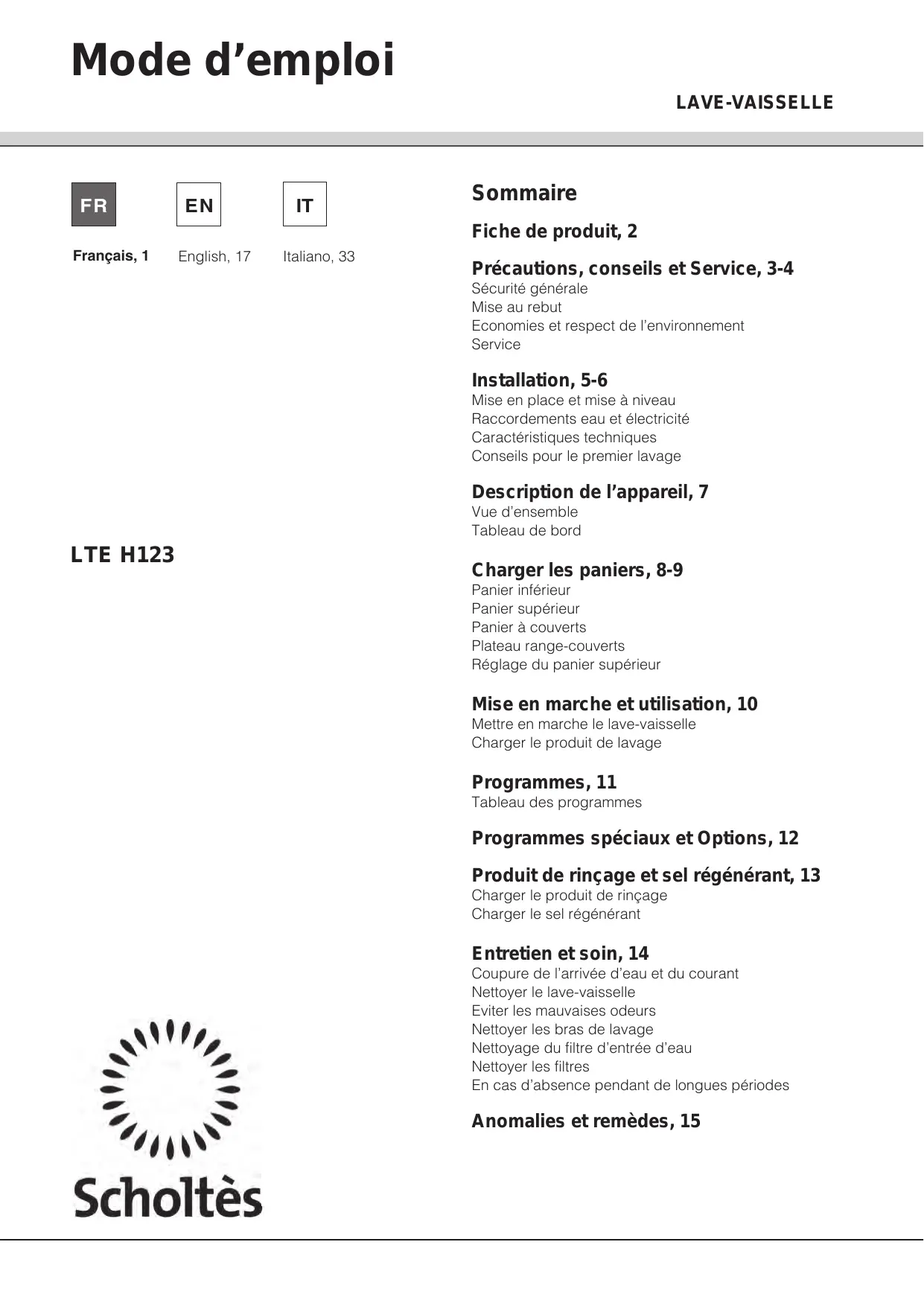 LTE H123 - Lave-vaisselle SCHOLTES - Notice d'utilisation et mode d'emploi gratuit