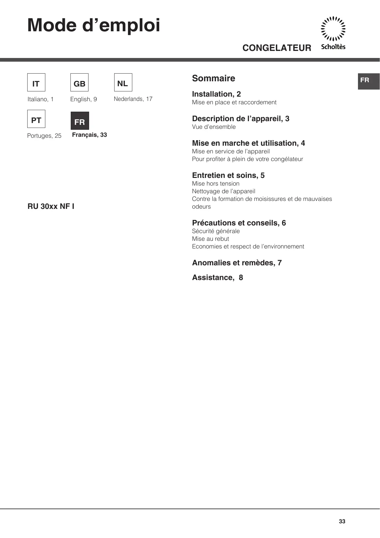 RU 3032 NF I - Congélateur SCHOLTES - Notice d'utilisation et mode d'emploi gratuit