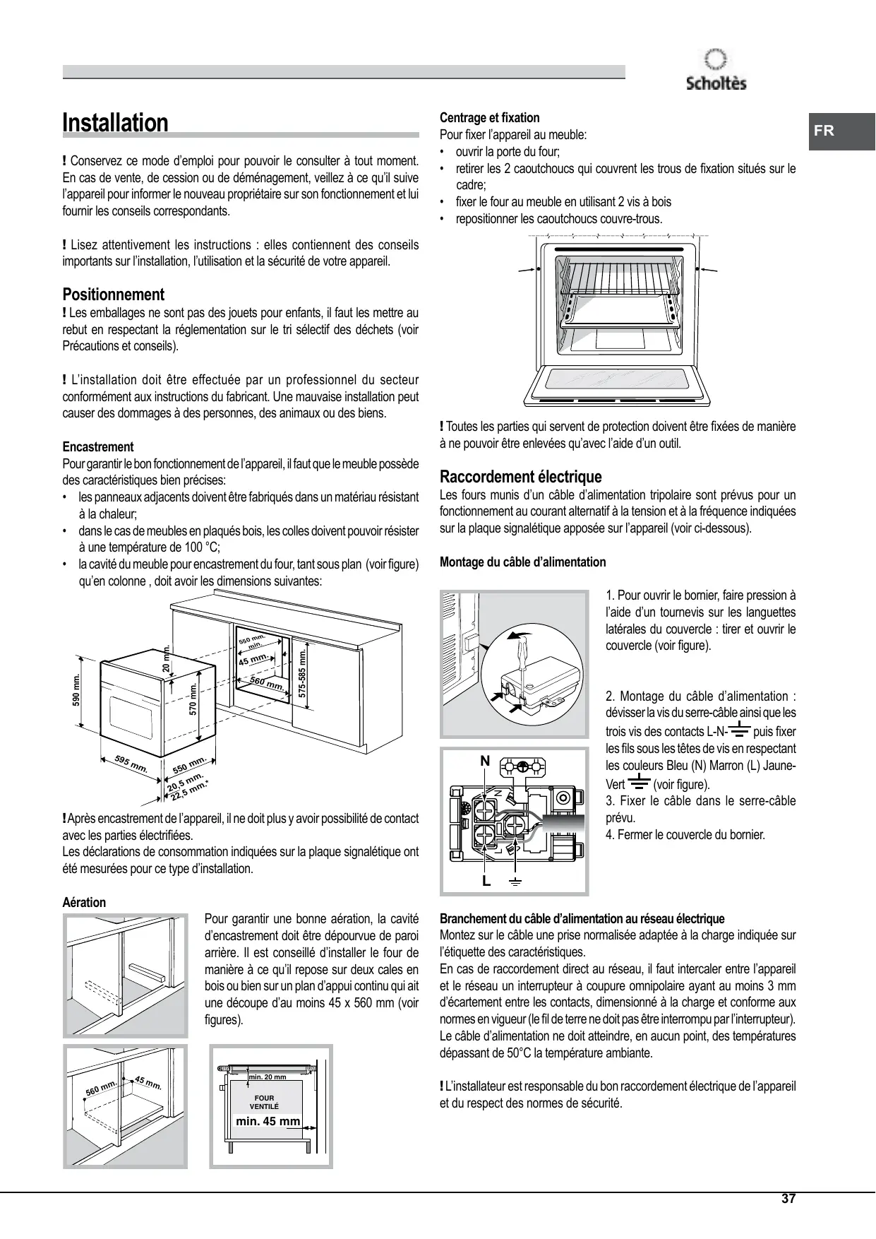 Pour garantir une bonne aération, la cavité d’encastrement doit être dépourvue de paroi arrière. Il est conseillé d’installer le four de manière à ce qu’il repose sur deux cales en bois ou bien sur un plan d’appui continu qui ait une découpe d’au moins 45 x 560 mm (voir figures).