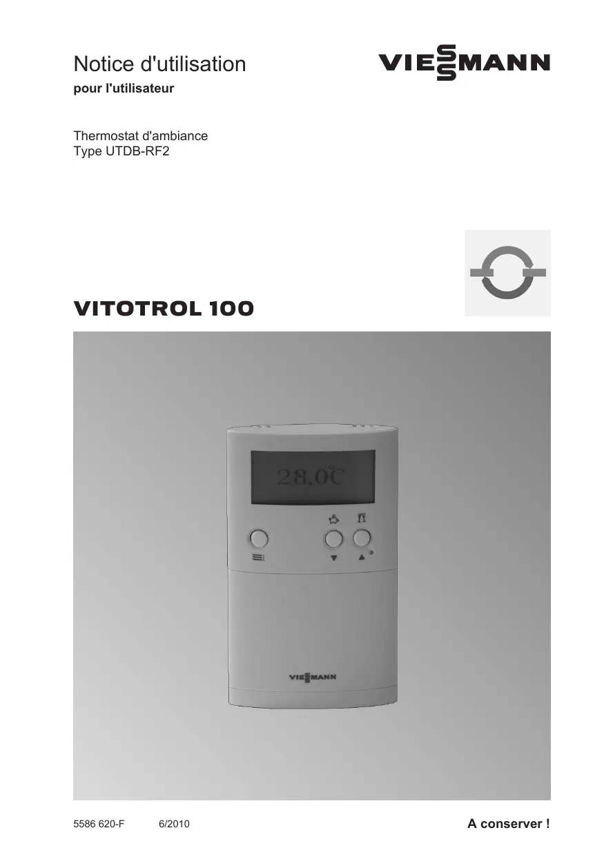 Notice d'utilisation VIESMANN pour l'utilisateur Thermostat d'ambiance Type UTDB-RF2 VITOTROL 100 5586 620-F 6/2010 A conserver ! Consignes de sécurité Pour votre sécurité Respecter scrupuleusement ces consignes de sécurité afin d'éviter tout risque et tout dommage pour les personnes et les biens. Explication des consignes de sécurité Danger Ce symbole met en garde contre les dommages pour les personnes.