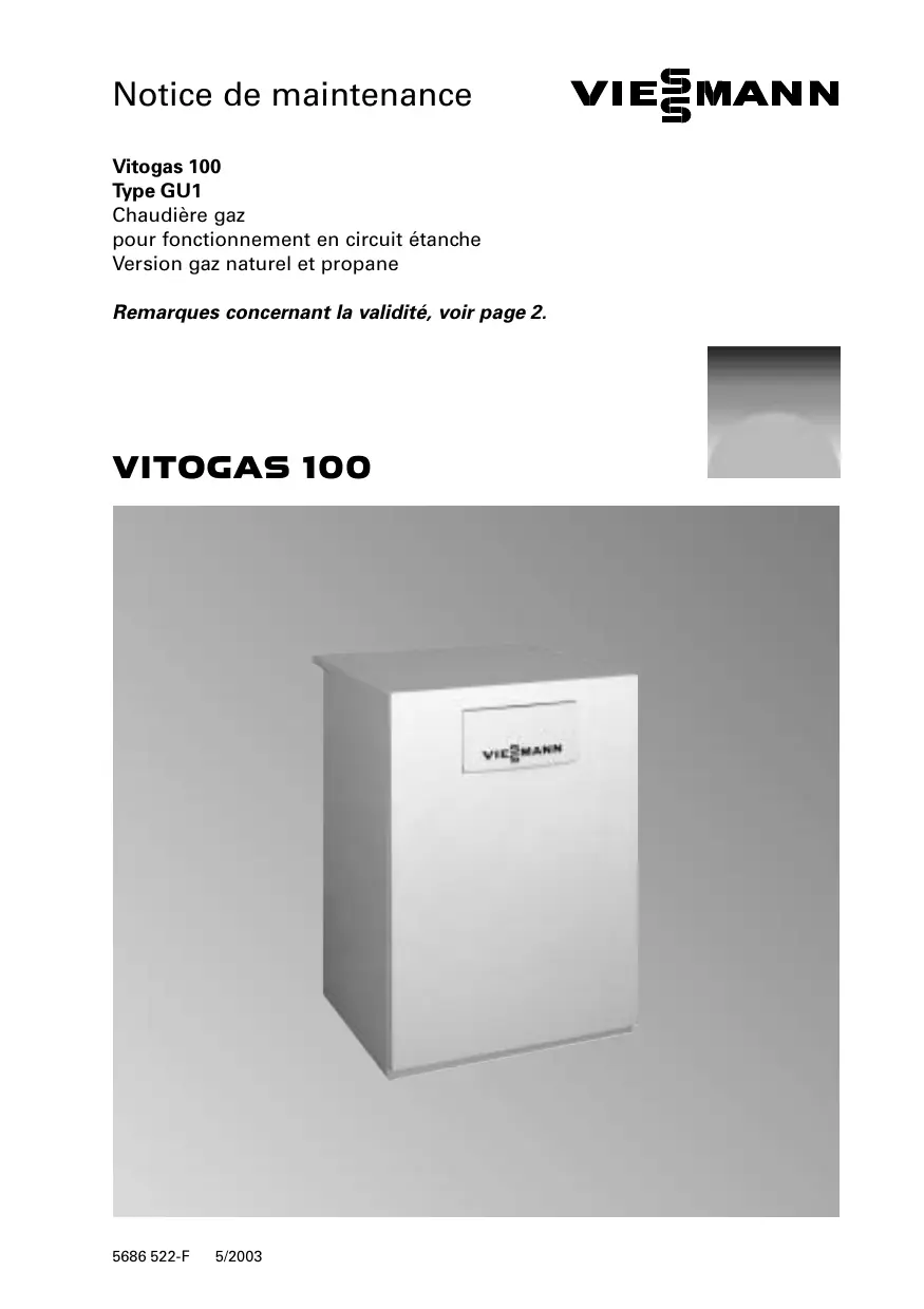 Notice de maintenance Vitogas100 TypeGU1 Chaudière gaz pour fonctionnement en circuit étanche Version gaz naturel et propane Remarques concernant la validité, voir page2. VITOGAS 100 5686522−F5/2003 Informations générales Conseils de sécurité Respecter scrupuleusement ces conseils de sécurité afin d’éviter tout risque et tout dommage pour les personnes et les biens. Travaux sur l’appareil Le montage, la première mise en service, le contrôle, l’entretien et les réparations devront être impérativement effectués par du personnel qualifié (installateurs/ chauffagistes). Couper l’alimentation électrique (au porte−fusible du tableau électrique ou à l’interrupteur principal, par exemple) avant de commencer l’intervention sur l’appareil/ l’installation de chauffage et la bloquer pour interdire tout rétablissement. Fermer la vanne d’alimentation gaz et la bloquer pour empêcher toute ouverture intempestive. Les travaux sur les conduites gaz ne devront être effectués que par un installateur qualifié. Les travaux de réparation sur les composants de sécurité sont interdits. Si on remplace des pièces, on devra employer les pièces d’origine Viessmann qui conviennent. Première mise en service La première mise en service devra être effectuée par l’installateur ou un spécialiste nommé par lui ; les valeurs mesurées seront consignées sur un procès−verbal. Explications à donner à l’utilisateur L’installateur devra remettre la notice d’utilisation à l’utilisateur et lui expliquer le fonctionnement de l’installation. ¨Conseil de sécurité ! Caractérise les informations importantes pour la sécurité des personnes et des biens. ¨ Caractérise les informations importantes pour la sécurité des biens. Remarques concernant la validité Valable pour les chaudières : 5686522−F Vitogas100 typeGU1 à partir des numéros de fabrication : 7170991300001kkk, 717099230001kkk