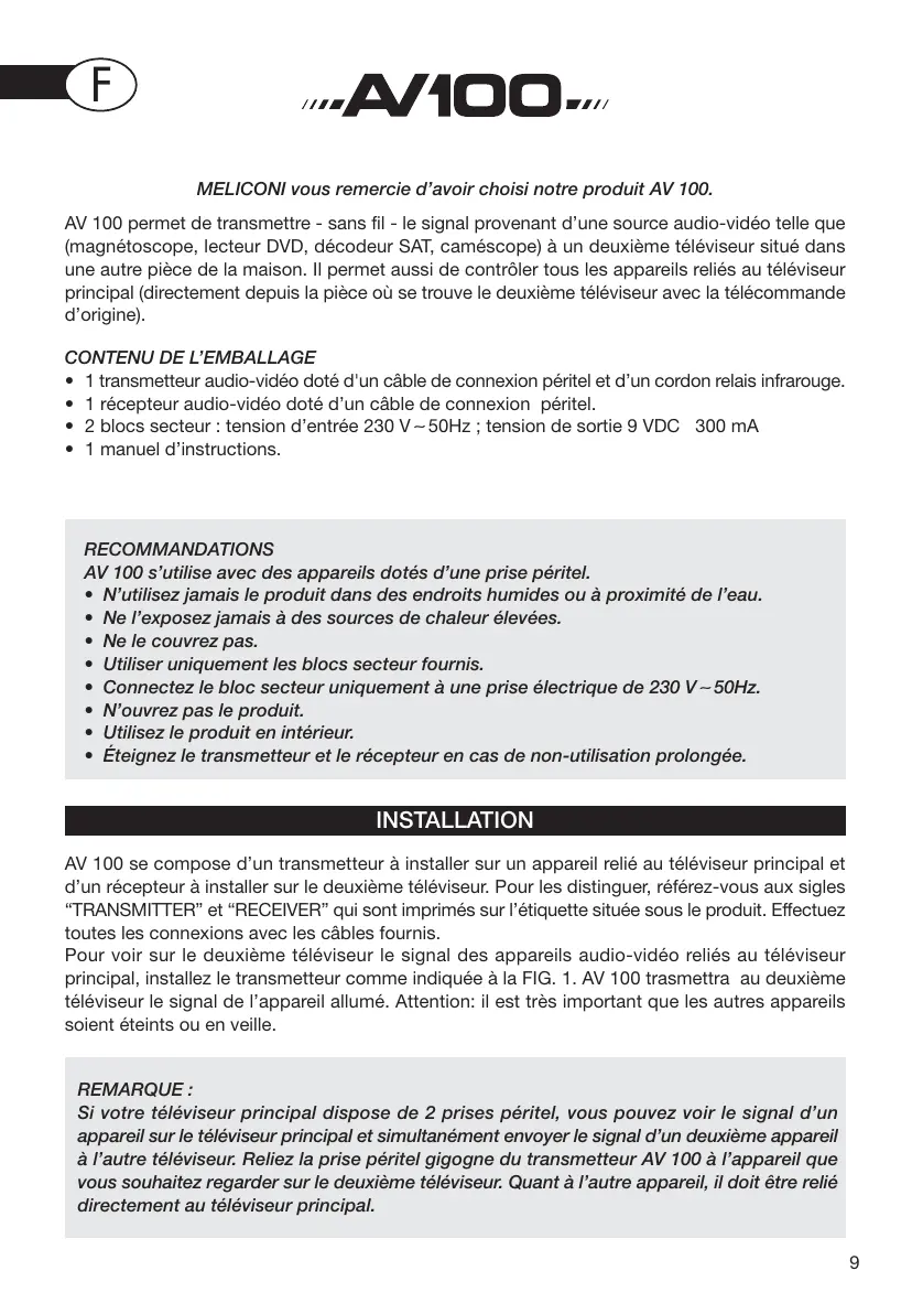 MELICONI vous remercie d’avoir choisi notre produit AV 100. AV 100 permet de transmettre - sans fil - le signal provenant d’une source audio-vidéo telle que (magnétoscope, lecteur DVD, décodeur SAT, caméscope) à un deuxième téléviseur situé dans une autre pièce de la maison. Il permet aussi de contrôler tous les appareils reliés au téléviseur principal (directement depuis la pièce où se trouve le deuxième téléviseur avec la télécommande d’origine).