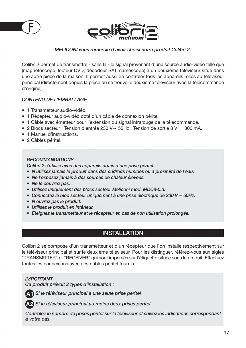 MELICONI vous remercie d'avoir choisi notre produit Colibrì 2. Colibrì 2 permet de transmettre - sans fil - le signal provenant d’une source audio-vidéo telle que (magnétoscope, lecteur DVD, décodeur SAT, caméscope) à un deuxième téléviseur situé dans une autre pièce de la maison. Il permet aussi de contrôler tous les appareils reliés au téléviseur principal (directement depuis la pièce où se trouve le deuxième téléviseur avec la télécommande d’origine).