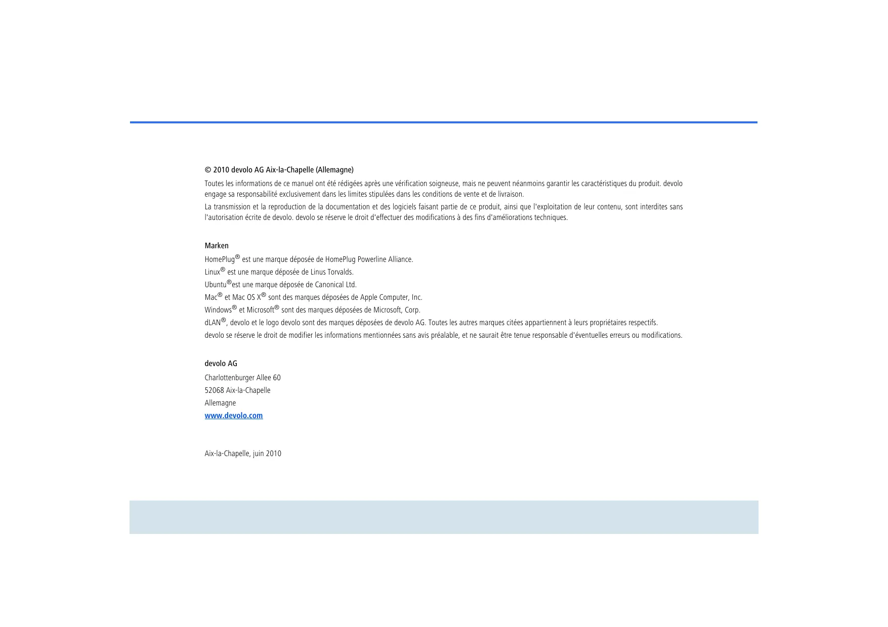 - © 2010 devolo AG Aix-la-Chapelle (Allemagne) Toutes les informations de ce manuel ont été rédigées après une vérification soigneuse, mais ne peuvent néanmoins garantir les caractéristiques du produit. devolo engage sa responsabilité exclusivement dans les limites stipulées dans les conditions de vente et de livraison. La transmission et la reproduction de la documentation et des logiciels faisant partie de ce produit, ainsi que l'exploitation de leur contenu, sont interdites sans l'autorisation écrite de devolo. devolo se réserve le droit d'effectuer des modifications à des fins d'améliorations techniques. Marken HomePlug® est une marque déposée de HomePlug Powerline Alliance. Linux® est une marque déposée de Linus Torvalds. Ubuntu®est une marque déposée de Canonical Ltd. Mac® et Mac OS X® sont des marques déposées de Apple Computer, Inc. Windows® et Microsoft® sont des marques déposées de Microsoft, Corp. dLAN®, devolo et le logo devolo sont des marques déposées de devolo AG. Toutes les autres marques citées appartiennent à leurs propriétaires respectifs. devolo se réserve le droit de modifier les informations mentionnées sans avis préalable, et ne saurait être tenue responsable d'éventuelles erreurs ou modifications. devolo AG Charlottenburger Allee 60 52068 Aix-la-Chapelle Allemagne www.devolo.com Aix-la-Chapelle, juin 2010 Contenu Contenu 1 Avant-propos p. 4