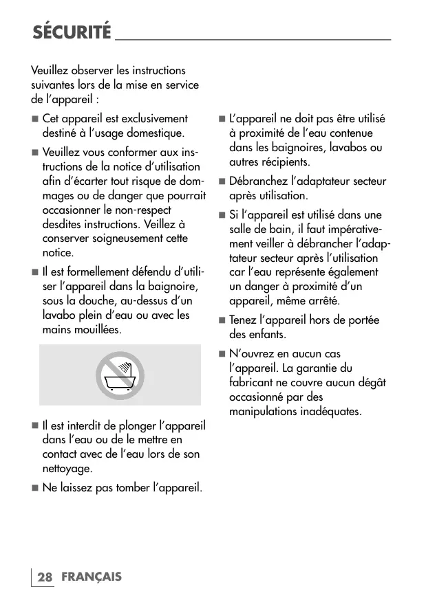 Cet appareil est exclusivement destiné à l'usage domestique. Veuillez vous conformer aux instructions de la notice d'utilisation afin d'écarter tout risque de dommages ou de danger que pourrait occasionner le non-respect desdites instructions. Veillez à conserver soigneusement cette notice. Il est formellement défendu d'utiliser l'appareil dans la baignoire, sous la douche, au-dessus d'un lavabo plein d'eau ou avec les mains mouillées.