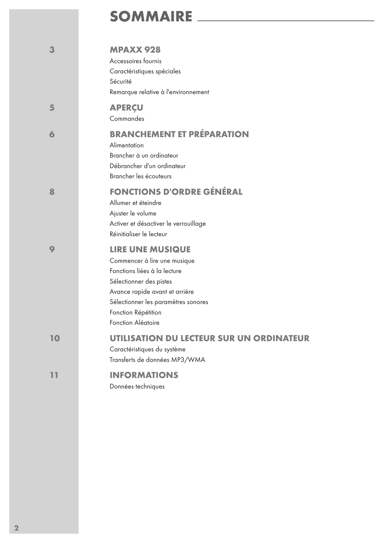 INFORMATIONS Données techniques 2 MPAxx 928 -----------------------------------------------------------------------------------------------------------------------------------Accessoires fournis 1 Écouteurs stéréo résistants à l'eau 2 Adaptateur USB 3 Brassard 4 Écouteurs-boutons 5 Quelques consignes Avertissement Il est conseillé de toujours utiliser le dispositif avec l’adaptateur USB fourni, sinon il pourra s’endommager avec le PC. Veuillez consulter votre revendeur GRUNDIG ou le centre de service agréé lorsque vous avez besoin d’un nouvel adaptateur USB. Remarque: Les composantes accessoires fournies peuvent varier. Caractéristiques spéciales Lecteur MP3/WMA combiné et support USB amovible. Adapté pour être utilisé sous une douche, un bain, ou en nageant à la surface d'une piscine ou d'une mer. Cet appareil a été conçu pour lire les fichiers musicaux et sert en même temps de disque amovible. Son utilisation à d'autres fins est formellement interdite. Ce lecteur musical numérique est imperméable à l'eau. Par conséquent, il est nécessaire que la prise d'écouteur soit branchée dans l'orifice prévu à cet effet avant toute manipulation en présence de l'eau. Vérifiez que la prise d'écouteur est bien raccordée au lecteur. Ne laissez pas tomber l'appareil. Évitez également de le poser tout près des objets magnétiques. Assurez-vous qu'il est protégé contre la lumière directe du soleil et de la chaleur. Ne jamais ouvrir le boîtier de l'appareil. Aucune revendication au titre de la garantie ne sera acceptée concernant les dommages occasionnés par une mauvaise manipulation. Évitez d'exposer les batteries à une chaleur extrême, provoquée par exemple par la lumière directe du soleil, des appareils de chauffage, ou du feu. Évitez d'écouter de la musique à un niveau de volume élevé pendant longtemps pour être à l'abri des problèmes d'audition. Après avoir été au contact de l'eau de mer, l'appareil et les écouteurs doivent être nettoyés à l'eau potable. L'écouteur doit être branché dans la prise. Il est interdit d'utiliser des agents nettoyants. L'appareil résiste à l'eau en deçà d'une profondeur de 3 mètres, pendant 3 heures. L'eau peut s'inviter dans l'écouteur et réduire les performances du volume pendant une séance de nage. Nettoyez l'eau contenue dans l'écouteur pour améliorer la qualité de son volume. Évitez de débrancher l'adaptateur USB ou l'écouteur de l'appareil en tirant sur le cordon. Assurez-vous de débrancher en tirant plutôt sur le connecteur. Tenir le lecteur hors de portée des bébés et des enfants. Ces derniers risquent en effet de l'avaler. Évitez que l'appareil soit au contact des produits chimiques comme le benzène, le diluant, etc. Assurez-vous que la prise de branchement des écouteurs ou de l‘adaptateur USB est sèche avant de raccorder le dispositif à l‘ordinateur. Dans le cas contraire, le système ne fonctionnera pas correctement. Remarque: Les motocyclistes, les cyclistes, les piétons et tous les autres usagers ne doivent pas utiliser l'appareil sur la route. Il pose un risque en matière de sécurité routière. FRANCAIS Informations et sécurité 3 MPAxx 928 -----------------------------------------------------------------------------------------------------------------------------------Remarque relative à l'environnement Ce produit a été fabriqué avec des pièces de qualité supérieure et des matériaux susceptibles d'être réutilisés. Ils sont donc appropriés pour le recyclage. Par conséquent, il est conseillé de ne pas jeter cet appareil dans les ordures ménagères à la fin de sa durée de vie. Rendez-vous plutôt dans un centre de collecte pour le recyclage de ses pièces électriques et électroniques. Cette interdiction est illustrée par le symbole ci-contre que vous retrouverez sur le produit, dans le manuel d'utilisation, et sur l'emballage. Veuillez vous renseigner auprès de l'autorité locale au sujet des points de collecte les plus proches. Participez à la protection de l'environnement en recyclant les produits usagés. 4 APERÇU ----------------------------------------------------------------------------------------------------------------------------------------------------------Commandes