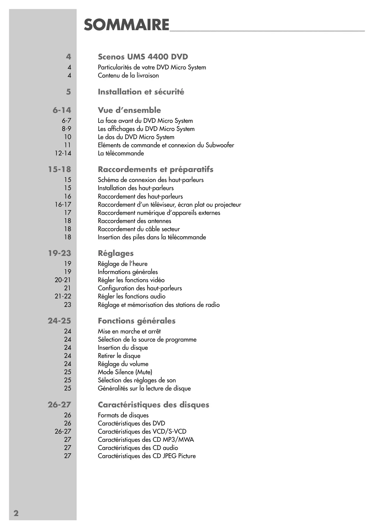 Particularités de votre DVD Micro System Votre DVD Micro System vous donne une image numérique parfaite, de qualité studio. Selon le type de DVD ou de CD, le son peut être rendu en stéréo ou comme son multi-canaux numérique avec une excellente qualité de niveau cinéma. Outre les DVD, il est également possible de lire les CD vidéo, les CD S-vidéo, les CD MP3 ou WMA, les CD audio ainsi que les CD d’images JPEG. Par ailleurs, le DVD Micro System lit aussi les DVD R ou DVD RW à données vidéo gravés manuellement ainsi que les CD-R et CD-RW à données audio gravés manuellement. Contenu de la livraison 1 DVD Micro System Scenos UMS 4400