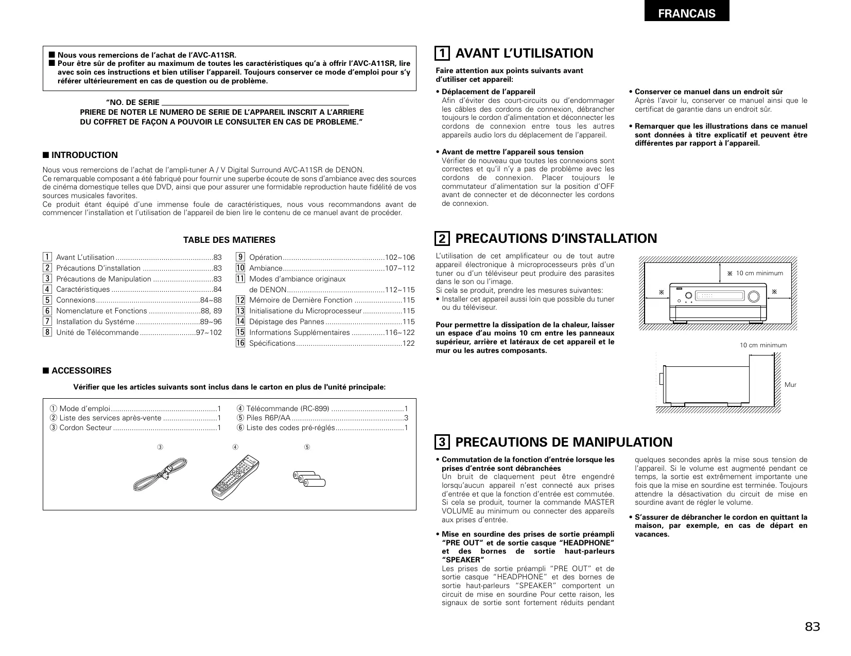 - PRIERE DE NOTER LE NUMERO DE SERIE DE L’APPAREIL INSCRIT A L’ARRIERE DU COFFRET DE FAÇON A POUVOIR LE CONSULTER EN CAS DE PROBLEME.” 2 INTRODUCTION Nous vous remercions de l’achat de l’ampli-tuner A / V Digital Surround AVC-A11SR de DENON. Ce remarquable composant a été fabriqué pour fournir une superbe écoute de sons d’ambiance avec des sources de cinéma domestique telles que DVD, ainsi que pour assurer une formidable reproduction haute fidélité de vos sources musicales favorites. Ce produit étant équipé d’une immense foule de caractéristiques, nous vous recommandons avant de commencer l’installation et l’utilisation de l’appareil de bien lire le contenu de ce manuel avant de procéder. Avant L’utilisation p. 83