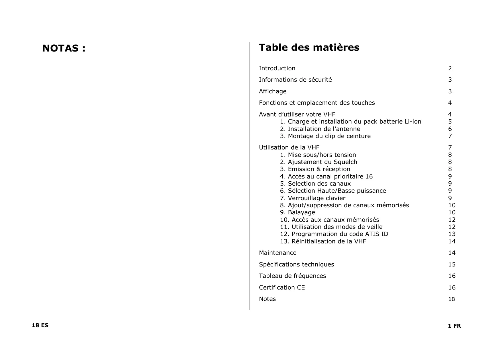Maintenance 14 Spécifications techniques 15 Tableau de fréquences 16 Certification CE 16 Notes 18