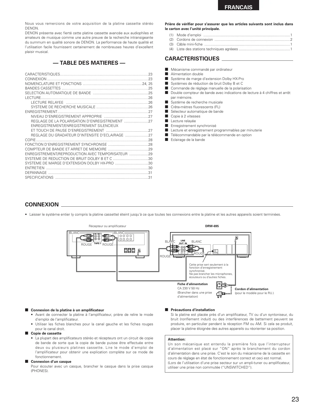 DRW-695 - Lecteur de CD et cassette DENON - Notice d'utilisation et mode d'emploi gratuit