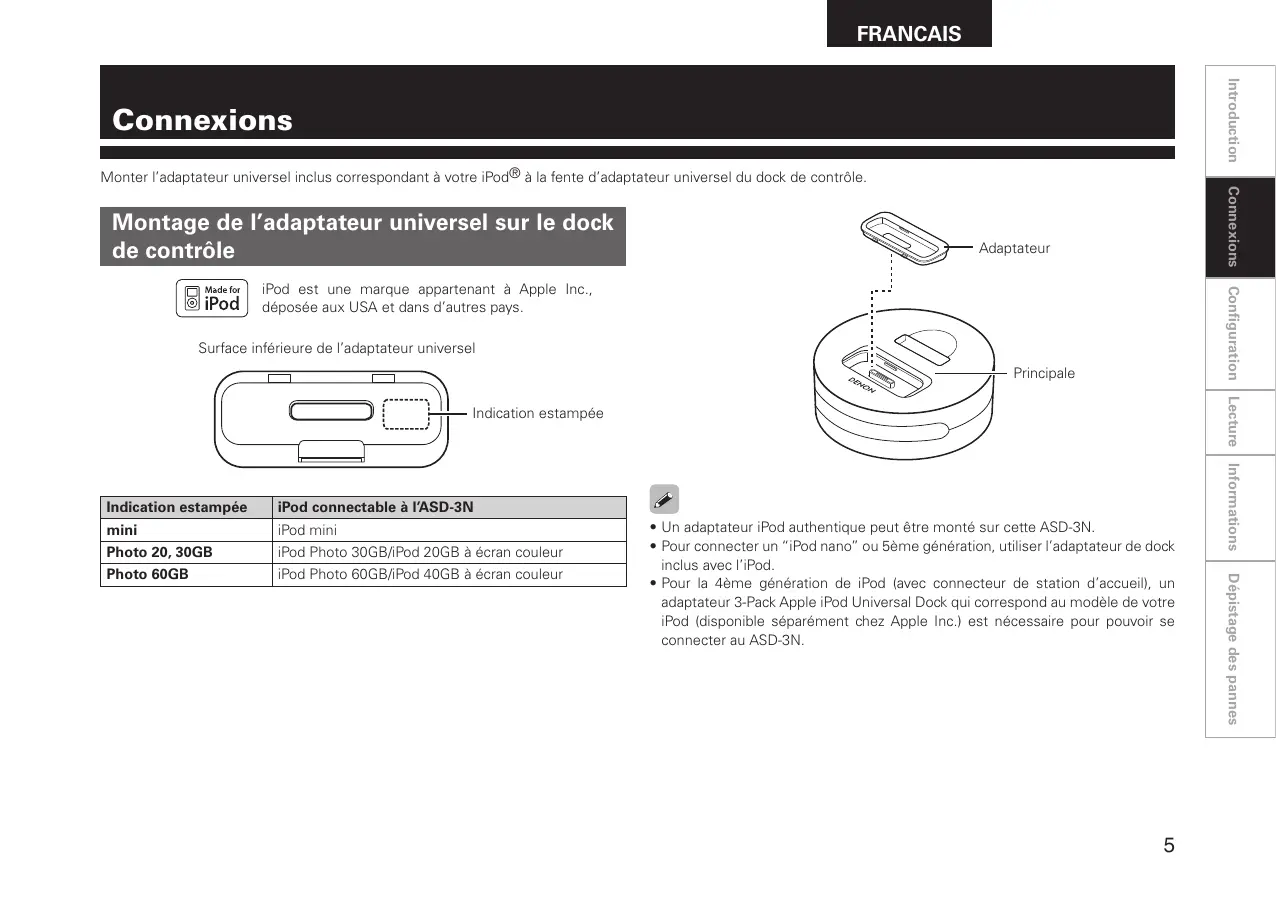 - Pour connecter un “iPod nano” ou 5ème génération, utiliser l’adaptateur de dock inclus avec l’iPod.