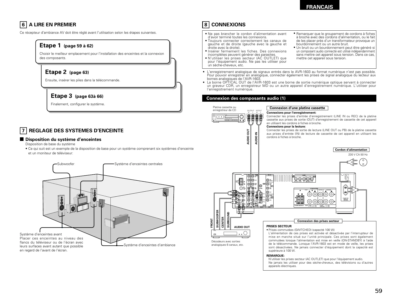 8 CONNEXIONS Ce récepteur d’ambiance AV doit être réglé avant l’utilisation selon les étapes suivantes. Etape 1 (page 59 à 62) Choisir le meilleur emplacement pour l’installation des enceintes et la connexion des composants. Etape 2