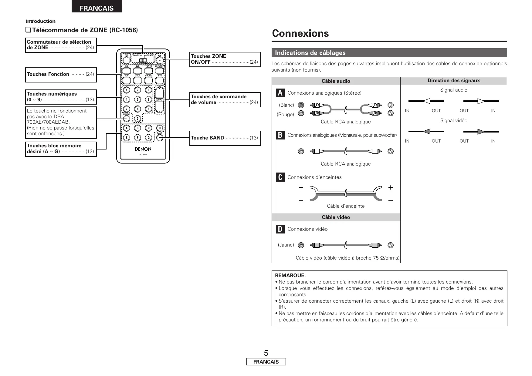 FRANCAIS FRANCAIS Introduction ¢ Télécommande de ZONE (RC-1056) Connexions Commutateur de sélection de ZONE ··························(24) Indications de câblages Touches ZONE ON/OFF ···························(24) Les schémas de liaisons des pages suivantes impliquent l’utilisation des câbles de connexion optionnels suivants (non fournis). Touches Fonction ···········(24) Direction des signaux Câble audio Touches numériques (0 ~ 9)·······························(13) Le touche ne fonctionnent pas avec le DRA700AE/700AEDAB. (Rien ne se passe lorsqu’elles sont enfoncées.)