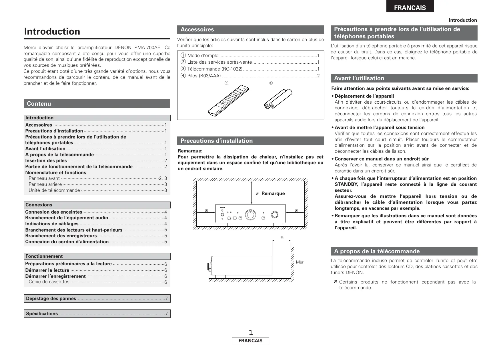 - Remarquer que les illustrations dans ce manuel sont données à titre explicatif et peuvent être différentes par rapport à l’appareil. A propos de la télécommande Fonctionnement Mur Préparations préliminaires à la lecture ·······································6 Démarrer la lecture ·······································································6 Démarrer l’enregistrement ···························································6 Copie de cassettes ·······································································6 La télécommande incluse permet de contrôler l’unité et peut être utilisée pour contrôler des lecteurs CD, des platines cassettes et des tuners DENON. Certains produits ne fonctionnent cependant pas avec la télécommande. Depistage des pannes...................................................................7 Spécifications.................................................................................7