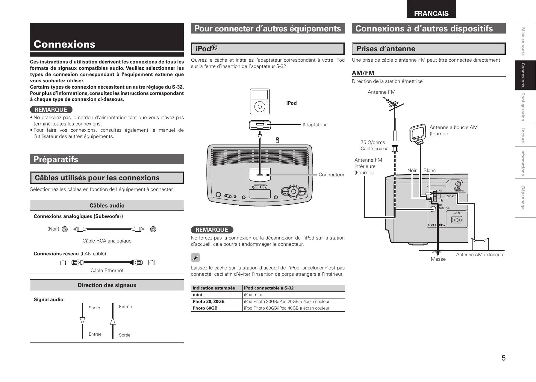 Connexions Ces instructions d’utilisation décrivent les connexions de tous les formats de signaux compatibles audio. Veuillez sélectionner les types de connexion correspondant à l’équipement externe que vous souhaitez utiliser. Certains types de connexion nécessitent un autre réglage du S-32. Pour plus d’informations, consultez les instructions correspondant à chaque type de connexion ci-dessous. Connexions à d’autres dispositifs Mise en route Connexions Pour connecter d’autres équipements Antenne AM extérieure Laissez le cache sur la station d’accueil de l’iPod, si celui-ci n’est pas connecté, ceci afin d’éviter l’insertion de corps étrangers à l’intérieur. Indication estampée iPod connectable à S-32 mini iPod mini Photo 20, 30GB iPod Photo 30GB/iPod 20GB à écran couleur Photo 60GB iPod Photo 60GB/iPod 40GB à écran couleur Sortie