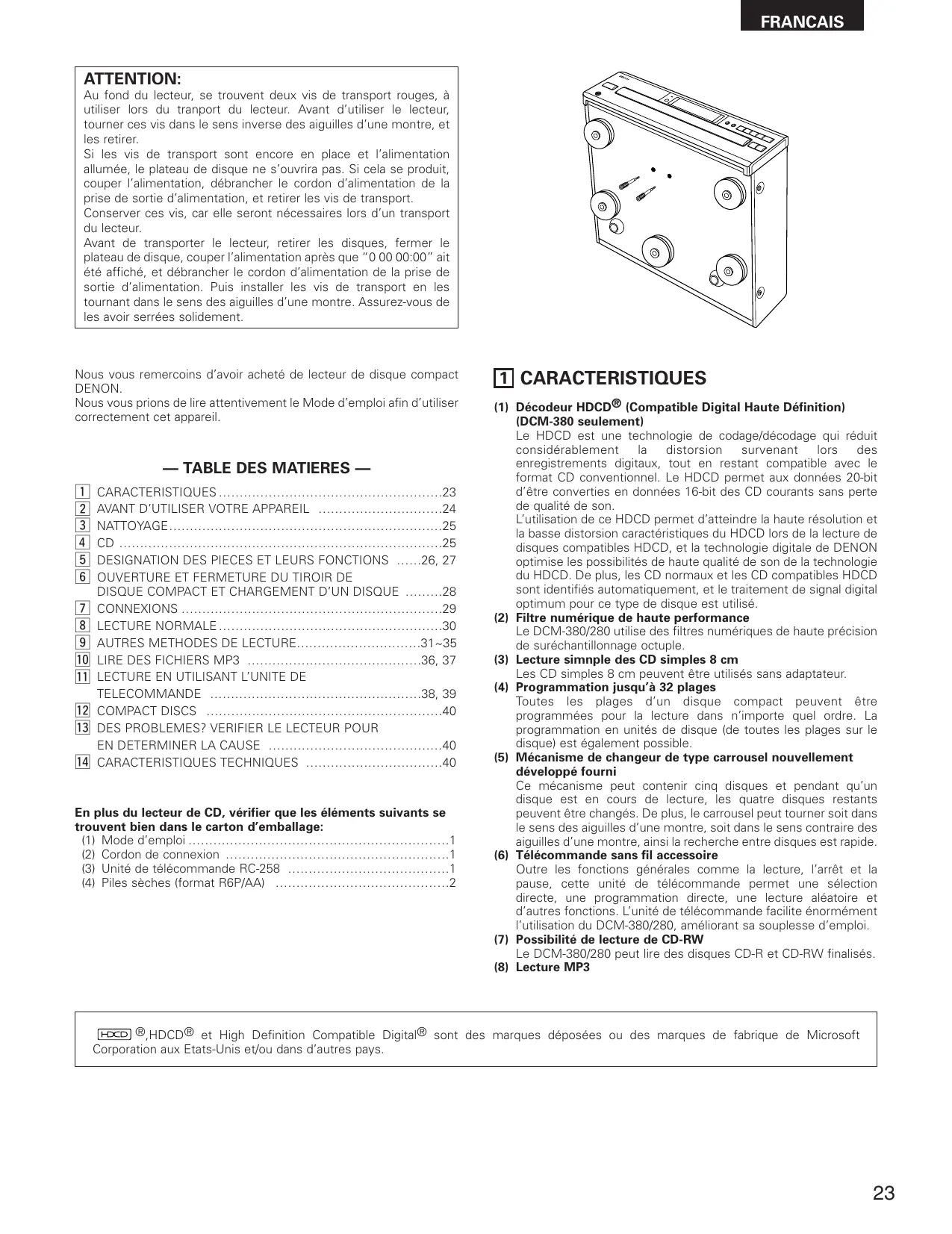 (1) Décodeur HDCD® (Compatible Digital Haute Définition) (DCM-380 seulement) Le HDCD est une technologie de codage/décodage qui réduit considérablement la distorsion survenant lors des enregistrements digitaux, tout en restant compatible avec le format CD conventionnel. Le HDCD permet aux données 20-bit d’être converties en données 16-bit des CD courants sans perte de qualité de son. L’utilisation de ce HDCD permet d’atteindre la haute résolution et la basse distorsion caractéristiques du HDCD lors de la lecture de disques compatibles HDCD, et la technologie digitale de DENON optimise les possibilités de haute qualité de son de la technologie du HDCD. De plus, les CD normaux et les CD compatibles HDCD sont identifiés automatiquement, et le traitement de signal digital optimum pour ce type de disque est utilisé. (2) Filtre numérique de haute performance Le DCM-380/280 utilise des filtres numériques de haute précision de suréchantillonnage octuple. (3) Lecture simnple des CD simples 8 cm Les CD simples 8 cm peuvent être utilisés sans adaptateur. (4) Programmation jusqu’à 32 plages Toutes les plages d’un disque compact peuvent être programmées pour la lecture dans n’importe quel ordre. La programmation en unités de disque (de toutes les plages sur le disque) est également possible. (5) Mécanisme de changeur de type carrousel nouvellement développé fourni Ce mécanisme peut contenir cinq disques et pendant qu’un disque est en cours de lecture, les quatre disques restants peuvent être changés. De plus, le carrousel peut tourner soit dans le sens des aiguilles d’une montre, soit dans le sens contraire des aiguilles d’une montre, ainsi la recherche entre disques est rapide. (6) Télécommande sans fil accessoire Outre les fonctions générales comme la lecture, l’arrêt et la pause, cette unité de télécommande permet une sélection directe, une programmation directe, une lecture aléatoire et d’autres fonctions. L’unité de télécommande facilite énormément l’utilisation du DCM-380/280, améliorant sa souplesse d’emploi. (7) Possibilité de lecture de CD-RW Le DCM-380/280 peut lire des disques CD-R et CD-RW finalisés. (8) Lecture MP3