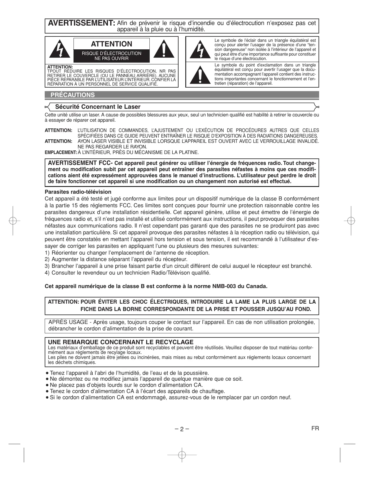 Cette unité utilise un laser. A cause de possibles blessures aux yeux, seul un technicien qualifié est habilité à retarder le couvercle ou à essayer de réparer cet apparéil.