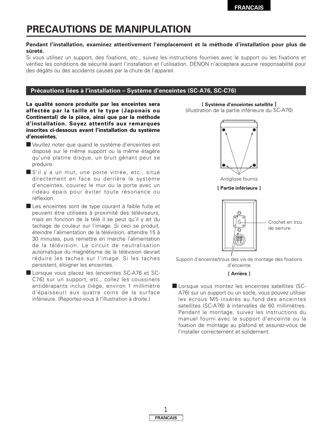 • Si vous installez les systèmes d’enceintes au plafond ou au mur, pour assurer la sécurité, laissez des spécialistes effectuer le travail d’installation. • Veillez à fixer les cordons des enceintes au mur, etc., pour éviter que les gens trébuchent dessus ou bien tirent dessus accidentellement, provoquant la chute des systèmes d’enceintes. • Veillez à effectuer un contrôle de sécurité après l’installation des systèmes d’enceintes. Par la suite, effectuez des vérifications de sécurité à intervalles réguliers pour vous assurer qu’il n’y a aucun risque de chute des systèmes d’enceintes. DENON n’acceptera aucune responsabilité pour des dégâts ou accidents causés par un choix inapproprié du lieu d’installation ou par des procédures d’installation incorrectes.