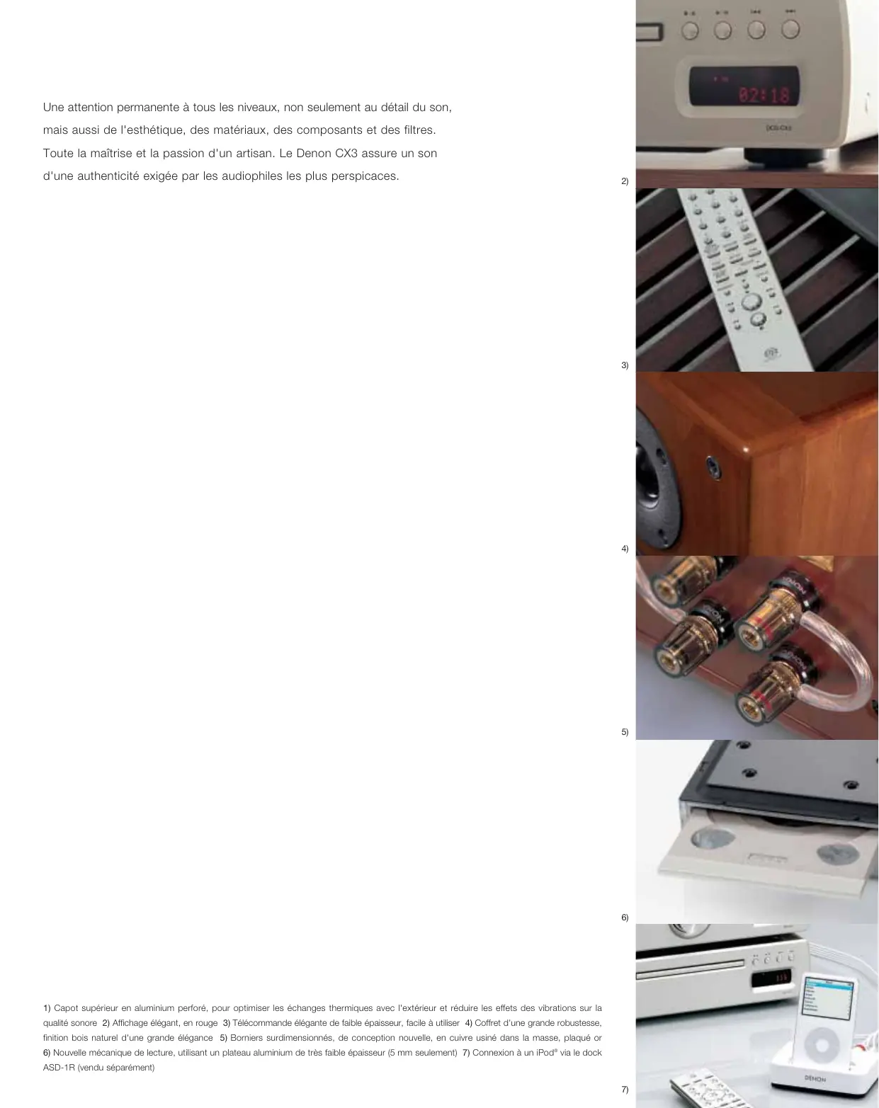 1) Capot supérieur en aluminium perforé, pour optimiser les échanges thermiques avec l'extérieur et réduire les effets des vibrations sur la qualité sonore 2) Affichage élégant, en rouge 3) Télécommande élégante de faible épaisseur, facile à utiliser 4) Coffret d'une grande robustesse, finition bois naturel d'une grande élégance 5) Borniers surdimensionnés, de conception nouvelle, en cuivre usiné dans la masse, plaqué or 6) Nouvelle mécanique de lecture, utilisant un plateau aluminium de très faible épaisseur (5 mm seulement) 7) Connexion à un iPod® via le dock ASD-1R (vendu séparément) 7)