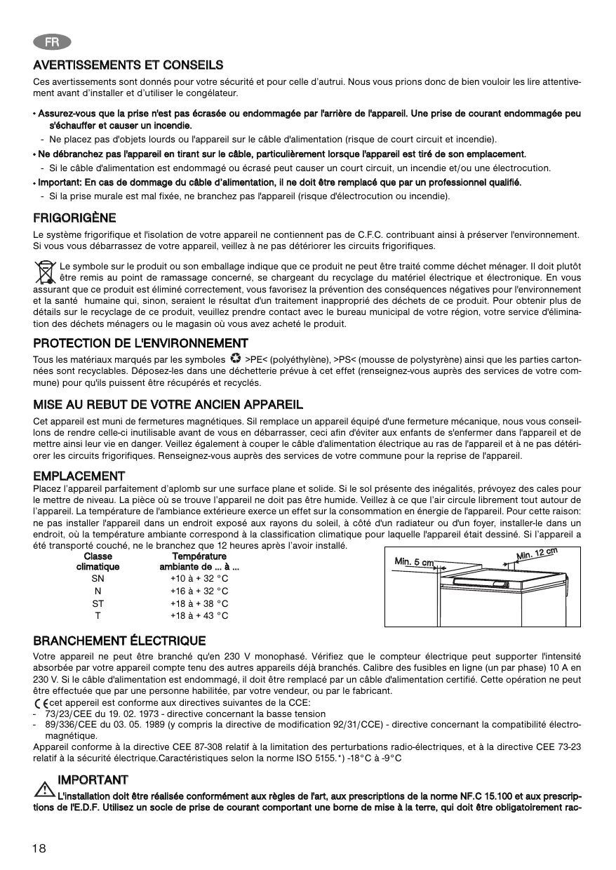 relatif à la sécurité électrique.Caractéristiques selon la norme ISO 5155.*) -18°C à -9°C IMPORTANT L'installation doit être réalisée conformément aux règles de l'art, aux prescriptions de la norme NF.C 15.100 et aux prescrip tions de l'E.D.F. Utilisez un socle de prise de courant comportant une borne de mise à la terre, qui doit être obligatoirement rac -