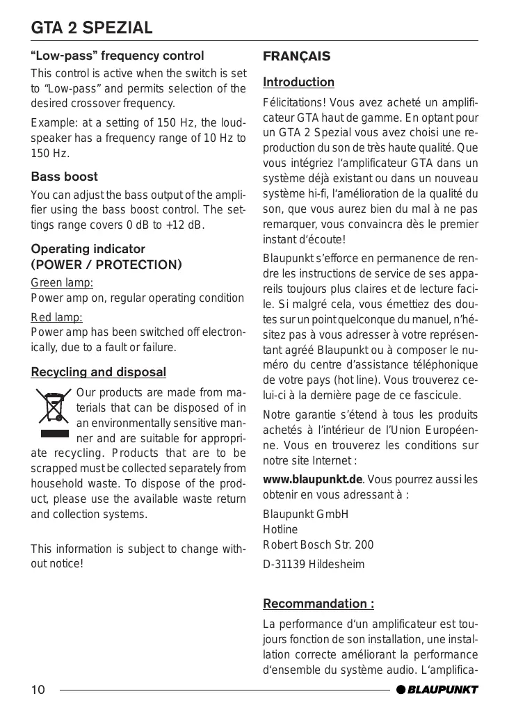 Félicitations! Vous avez acheté un amplificateur GTA haut de gamme. En optant pour un GTA 2 Spezial vous avez choisi une reproduction du son de très haute qualité. Que vous intégriez l‘amplificateur GTA dans un système déjà existant ou dans un nouveau système hi-fi, l‘amélioration de la qualité du son, que vous aurez bien du mal à ne pas remarquer, vous convaincra dès le premier instant d‘écoute! Blaupunkt s’efforce en permanence de rendre les instructions de service de ses appareils toujours plus claires et de lecture facile. Si malgré cela, vous émettiez des doutes sur un point quelconque du manuel, n’hésitez pas à vous adresser à votre représentant agréé Blaupunkt ou à composer le numéro du centre d’assistance téléphonique de votre pays (hot line). Vous trouverez celui-ci à la dernière page de ce fascicule. Notre garantie s’étend à tous les produits achetés à l’intérieur de l’Union Européenne. Vous en trouverez les conditions sur notre site Internet : www.blaupunkt.de. Vous pourrez aussi les obtenir en vous adressant à : Blaupunkt GmbH Hotline Robert Bosch Str. 200 D-31139 Hildesheim