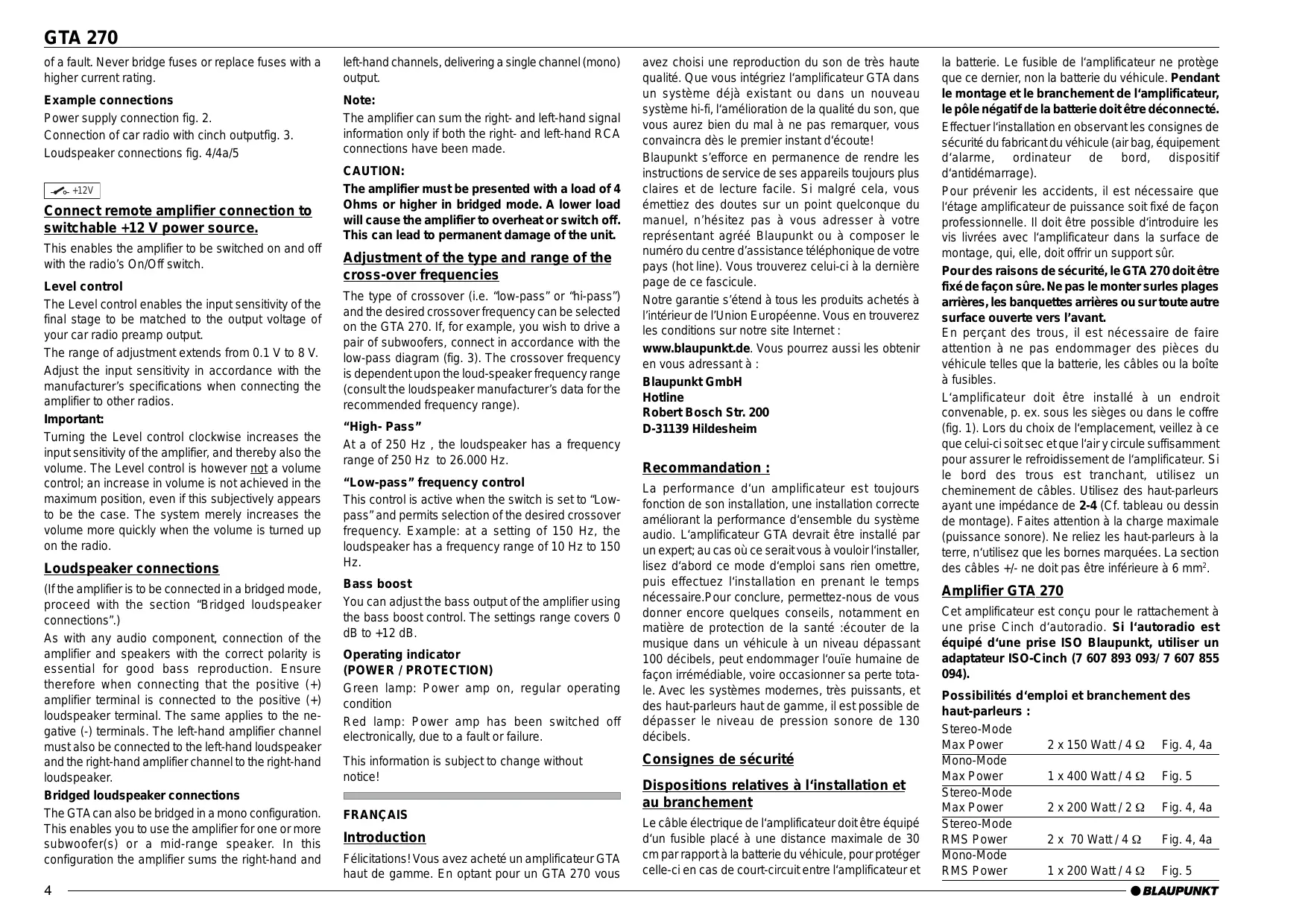 Amplifier GTA 270 Cet amplificateur est conçu pour le rattachement à une prise Cinch d‘autoradio. Si l‘autoradio est équipé d‘une prise ISO Blaupunkt, utiliser un adaptateur ISO-Cinch (7 607 893 093/ 7 607 855 094). Possibilités d‘emploi et branchement des haut-parleurs : Stereo-Mode Max Power 2 x 150 Watt / 4 Ω Fig. 4, 4a Mono-Mode Max Power 1 x 400 Watt / 4 Ω Fig. 5 Stereo-Mode Max Power 2 x 200 Watt / 2 Ω Fig. 4, 4a Stereo-Mode RMS Power 2 x 70 Watt / 4 Ω Fig. 4, 4a Mono-Mode RMS Power 1 x 200 Watt / 4 Ω Fig. 5