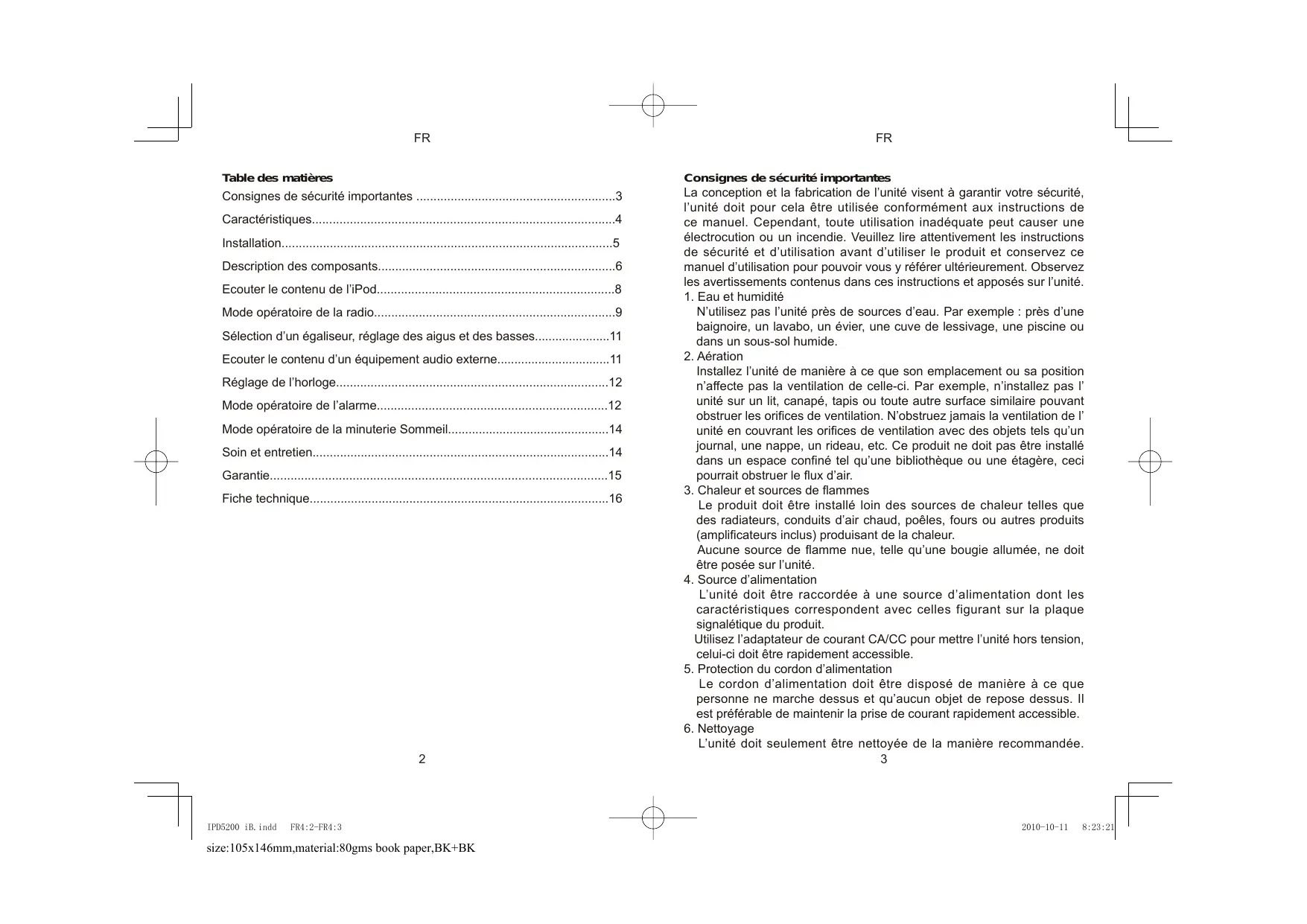 IPD5200 iB.indd FR4:4-FR4:5 Horloge et alarmes Réveil au son de l’alarme (Buzzer), de la radio ou de l’iPod, fonction Snooze. Minuterie Sommeil Ecran LCD avec rétro éclairage Connecteur d’entrée audio (AUXILIAIRE) permettant de raccorder un équipement audio externe. 2 haut-parleurs avec son haute fidélité intégrés. Egaliseurs préréglés. iPod, iPod mini, iPod Nano, iPod classique, iPod Shuffle et iPod touch sont des marques commerciales d’Apple Computer Inc., enregistrées aux Etats-Unis et dans d’autres pays. L’iPod n’est pas inclus. Installation Installation des piles de secours de l’horloge Le compartiment des piles de secours est situé sur le panneau arrière de l’unité. (1) Ouvrez le couvercle du compartiment à piles puis ouvrez le compartiment interne de l’horloge. (2)Pour installer les piles de secours de l’horloge, suivez le schéma de polarité indiqué dans le compartiment puis installez 2 piles AAA (UM-4) (vendues séparément). (3) Refermez le couvercle du compartiment à piles de secours de l’ horloge. Installation des piles (4) Pour pouvoir alimenter les fonctions radio, iPod et AUX, suivez le schéma de polarité indiqué à l’intérieur des compartiments à piles A et B puis installez 6 piles AAA (UM-3) (vendues séparément). (5) Refermez le couvercle du compartiment à piles principal. Raccordement de l’adaptateur de courant CA-CC L’unité peut être alimentée via un adaptateur de courant CA-CC délivrant une tension de 9 V CC 1250 mA (fourni). (1) Raccordez fermement la fiche de l’adaptateur de courant CA à une prise de courant CA. (2) Raccordez la fiche CC de l’adaptateur au connecteur d’alimentation CC de l’unité.