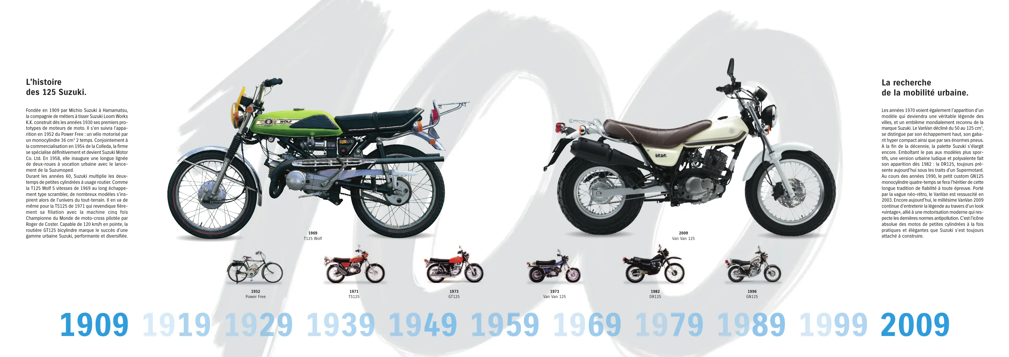 L'histoire des 125 Suzuki. La recherche de la mobilité urbaine. Fondée en 1909 par Michio Suzuki à Hamamatsu, la compagnie de métiers à tisser Suzuki Loom Works K.K. construit dès les années 1930 ses premiers prototypes de moteurs de moto. Il s’en suivra l’apparition en 1952 du Power Free : un vélo motorisé par un monocylindre 36 cm3 2 temps. Conjointement à la commercialisation en 1954 de la Colleda, la firme se spécialise définitivement et devient Suzuki Motor Co. Ltd. En 1958, elle inaugure une longue lignée de deux-roues à vocation urbaine avec le lancement de la Suzumoped. Durant les années 60, Suzuki multiplie les deuxtemps de petites cylindrées à usage routier. Comme la T125 Wolf 5 vitesses de 1969 au long échappement type scrambler, de nombreux modèles s’inspirent alors de l’univers du tout-terrain. Il en va de même pour la TS125 de 1971 qui revendique fièrement sa filiation avec la machine cinq fois Championne du Monde de moto-cross pilotée par Roger de Coster. Capable de 120 km/h en pointe, la routière GT125 bicylindre marque le succès d’une gamme urbaine Suzuki, performante et diversifiée. Les années 1970 voient également l’apparition d’un modèle qui deviendra une véritable légende des villes, et un emblème mondialement reconnu de la marque Suzuki. Le VanVan décliné du 50 au 125 cm3, se distingue par son échappement haut, son gabarit hyper compact ainsi que par ses énormes pneus. A la fin de la décennie, la palette Suzuki s’élargit encore. Emboîtant le pas aux modèles plus sportifs, une version urbaine ludique et polyvalente fait son apparition dès 1982 : la DR125, toujours présente aujourd’hui sous les traits d’un Supermotard. Au cours des années 1990, le petit custom GN125 monocylindre quatre-temps se fera l’héritier de cette longue tradition de fiabilité à toute épreuve. Porté par la vague néo-rétro, le VanVan est ressuscité en 2003. Encore aujourd’hui, le millésime VanVan 2009 continue d’entretenir la légende au travers d’un look «vintage», allié à une motorisation moderne qui respecte les dernières normes antipollution. C’est l’icône absolue des motos de petites cylindrées à la fois pratiques et élégantes que Suzuki s’est toujours attaché à construire.