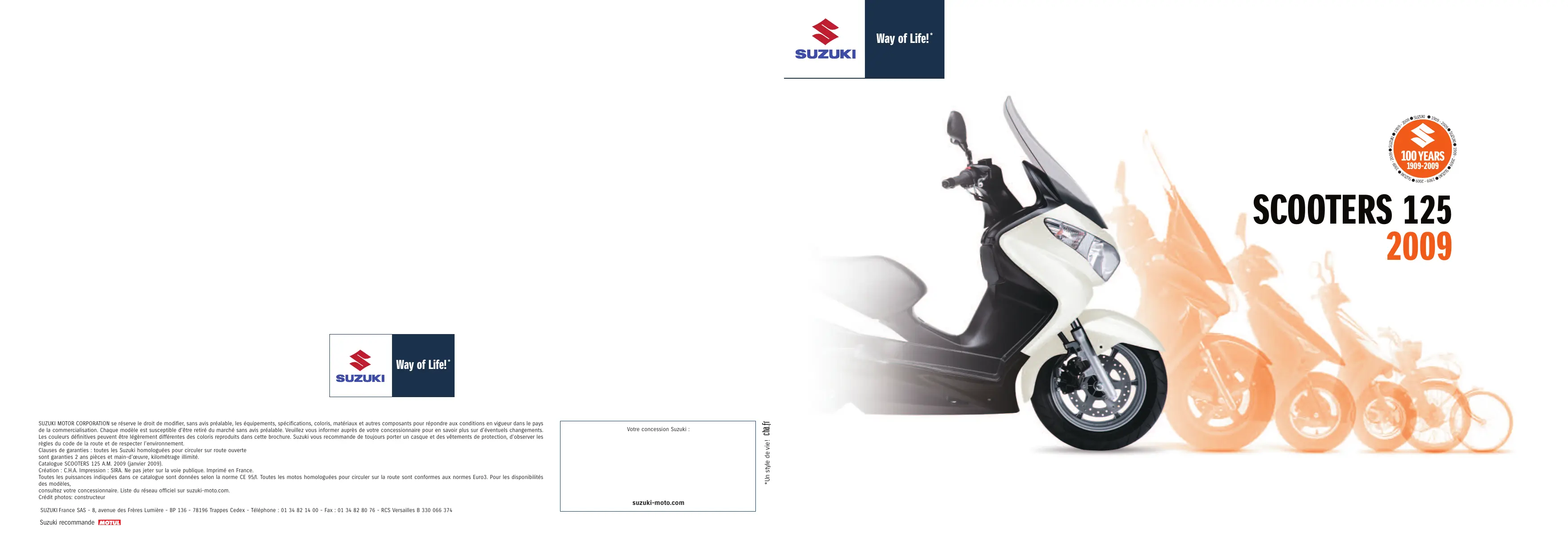 Votre concession Suzuki : *Un style de vie ! SUZUKI MOTOR CORPORATION se réserve le droit de modifier, sans avis préalable, les équipements, spécifications, coloris, matériaux et autres composants pour répondre aux conditions en vigueur dans le pays de la commercialisation. Chaque modèle est susceptible d’être retiré du marché sans avis préalable. Veuillez vous informer auprès de votre concessionnaire pour en savoir plus sur d’éventuels changements. Les couleurs définitives peuvent être légèrement différentes des coloris reproduits dans cette brochure. Suzuki vous recommande de toujours porter un casque et des vêtements de protection, d’observer les règles du code de la route et de respecter l’environnement. Clauses de garanties : toutes les Suzuki homologuées pour circuler sur route ouverte sont garanties 2 ans pièces et main-d’œuvre, kilométrage illimité. Catalogue SCOOTERS 125 A.M. 2009 (janvier 2009). Création : C.H.A. Impression : SIRA. Ne pas jeter sur la voie publique. Imprimé en France. Toutes les puissances indiquées dans ce catalogue sont données selon la norme CE 95/I. Toutes les motos homologuées pour circuler sur la route sont conformes aux normes Euro3. Pour les disponibilités des modèles, consultez votre concessionnaire. Liste du réseau officiel sur suzuki-moto.com. Crédit photos: constructeur suzuki-moto.com SUZUKI France SAS - 8, avenue des Frères Lumière - BP 136 - 78196 Trappes Cedex - Téléphone : 01 34 82 14 00 - Fax : 01 34 82 80 76 - RCS Versailles B 330 066 374 Suzuki recommande cha.fr Way of Life! * Les deux roues à vocation urbaine. L’alliance du confort et du sport. Fondée en 1909 par Michio Suzuki à Hamamatsu, la compagnie de métiers à tisser Suzuki Loom Works K.K. construit dès les années 1930 ses premiers prototypes de moteurs de moto. Il s’en suivra l’apparition en 1952 du Power Free : un vélo motorisé par un monocylindre 36 cm3 2 temps. Définitivement spécialisé dans la motorisation à partir de 1954, cette première firme devient alors Suzuki Motor Co. Ltd avec le lancement de la première Colleda. La Suzumoped, inaugure en 1958 une longue lignée de deux-roues à vocation urbaine. Décliné en de multiples versions, le M30 Cellpet motorisé par un monocylindre 2 temps 50 cm3 à boîte 4 vitesses laissera son empreinte sur les années 1960. La décennie 1970 sera le témoin de l’émergence des premiers véritables scooters Suzuki carénés avec la commercialisation du FR80 dès 1974, suivie en 1978, par l’arrivée en France du modèle FR50 monocylindre deux-temps à boîte 3 vitesses. Une gamme qui se développera notamment dans les années 1980 au travers du CL50 Love qui inaugure la fameuse transmission automatique V-Belt, et remplace les repose-pieds traditionnels par un large plancher plat. Alors que des modèles comme le RC50 entretiennent toujours la flamme et l’esthétique des robustes FR50, Suzuki décide en 1990 de faire basculer sa gamme scooter dans une nouvelle ère de sportivité, comme en témoigne le design nerveux du Sepia 49 cm3 deux-temps, dont les lignes tendues inspireront largement l’inépuisable AN125, archétype incontestable du deux-roues urbain économique et fiable. En 1998, Suzuki lance le Burgman 250 (au freinage couplé), ainsi qu’un modèle 400 cm3 qui inaugure l’ère des maxi-scooters. Complétée par l’Epicuro 125, la gamme des scooters Suzuki incarne la philosophie des deux-roues urbains : suffisamment puissants pour affronter les voies rapides, très confortables pour faciliter les trajets citadins et plaisants pour mettre un peu de gaîté dans le quotidien. C’est ce concept qui anime encore et toujours, le millésime 2009 du plus compact des maxi-scooters : le Burgman 125 ! CL50 Love