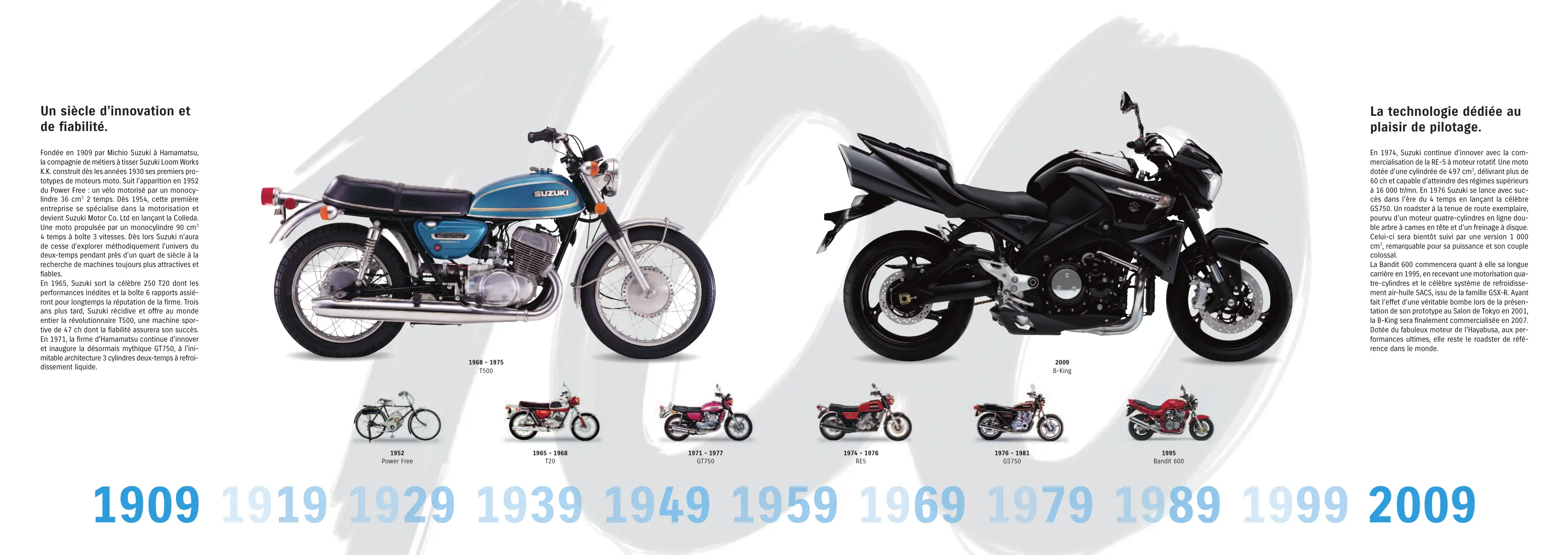 Un siècle d’innovation et de fiabilité. La technologie dédiée au plaisir de pilotage. Fondée en 1909 par Michio Suzuki à Hamamatsu, la compagnie de métiers à tisser Suzuki Loom Works K.K. construit dès les années 1930 ses premiers prototypes de moteurs moto. Suit l’apparition en 1952 du Power Free : un vélo motorisé par un monocylindre 36 cm3 2 temps. Dès 1954, cette première entreprise se spécialise dans la motorisation et devient Suzuki Motor Co. Ltd en lançant la Colleda. Une moto propulsée par un monocylindre 90 cm3 4 temps à boîte 3 vitesses. Dès lors Suzuki n’aura de cesse d’explorer méthodiquement l’univers du deux-temps pendant près d’un quart de siècle à la recherche de machines toujours plus attractives et fiables. En 1965, Suzuki sort la célèbre 250 T20 dont les performances inédites et la boîte 6 rapports assiéront pour longtemps la réputation de la firme. Trois ans plus tard, Suzuki récidive et offre au monde entier la révolutionnaire T500, une machine sportive de 47 ch dont la fiabilité assurera son succès. En 1971, la firme d’Hamamatsu continue d’innover et inaugure la désormais mythique GT750, à l’inimitable architecture 3 cylindres deux-temps à refroidissement liquide. En 1974, Suzuki continue d’innover avec la commercialisation de la RE-5 à moteur rotatif. Une moto dotée d’une cylindrée de 497 cm3, délivrant plus de 60 ch et capable d’atteindre des régimes supérieurs à 16 000 tr/mn. En 1976 Suzuki se lance avec succès dans l’ère du 4 temps en lançant la célèbre GS750. Un roadster à la tenue de route exemplaire, pourvu d’un moteur quatre-cylindres en ligne double arbre à cames en tête et d’un freinage à disque. Celui-ci sera bientôt suivi par une version 1 000 cm3, remarquable pour sa puissance et son couple colossal. La Bandit 600 commencera quant à elle sa longue carrière en 1995, en recevant une motorisation quatre-cylindres et le célèbre système de refroidissement air-huile SACS, issu de la famille GSX-R. Ayant fait l’effet d’une véritable bombe lors de la présentation de son prototype au Salon de Tokyo en 2001, la B-King sera finalement commercialisée en 2007. Dotée du fabuleux moteur de l'Hayabusa, aux performances ultimes, elle reste le roadster de référence dans le monde. 1968 - 1975 T500